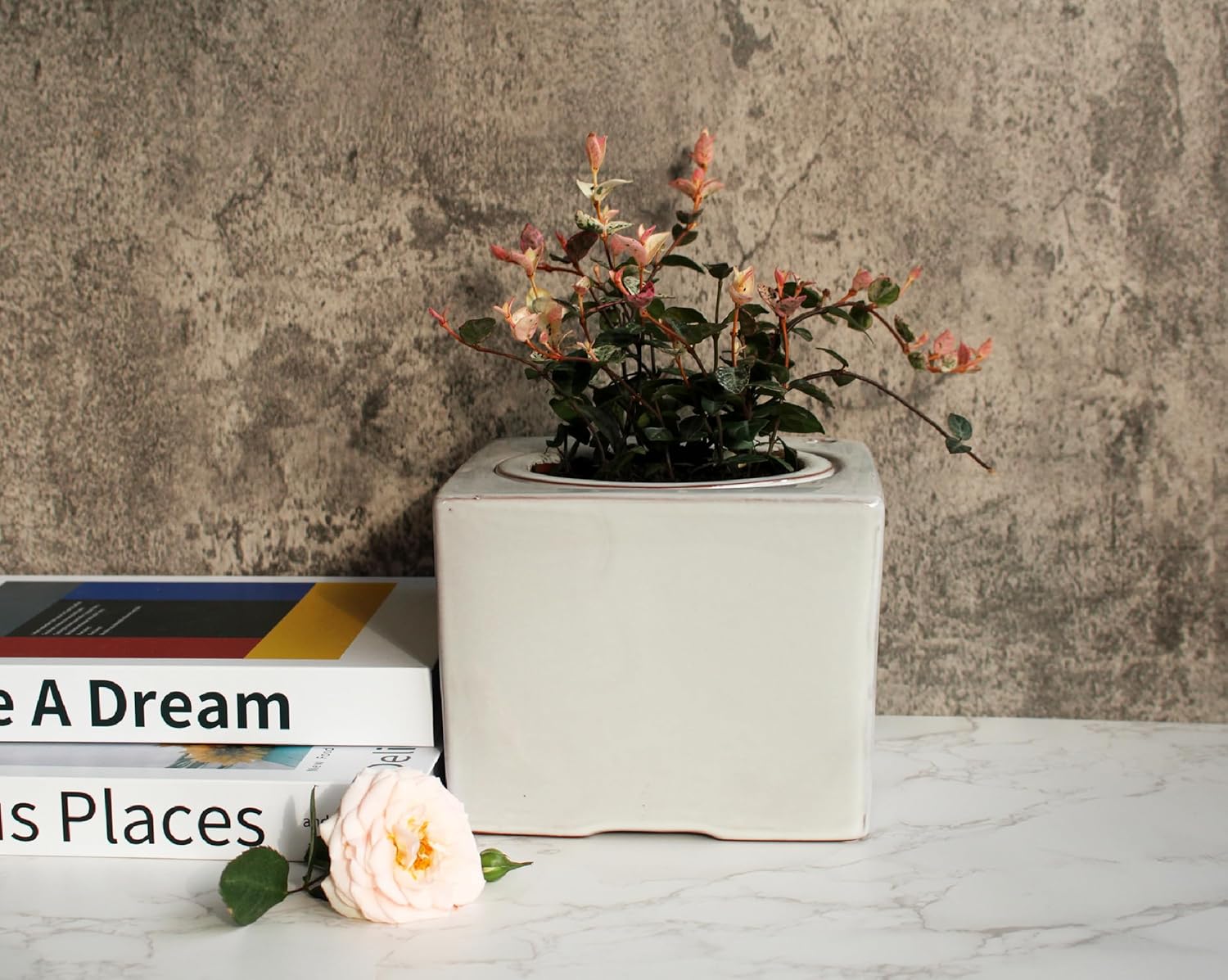 - Elegant Color Options and Dimensions: Choose from sophisticated Blue or Cream White to complement your style and add a touch of sophistication to your plant display. The product dimensions are: Inner Pot - 3.75" opening, 3.5" tall; Outside Square - 6" wide, 4.6" tall.