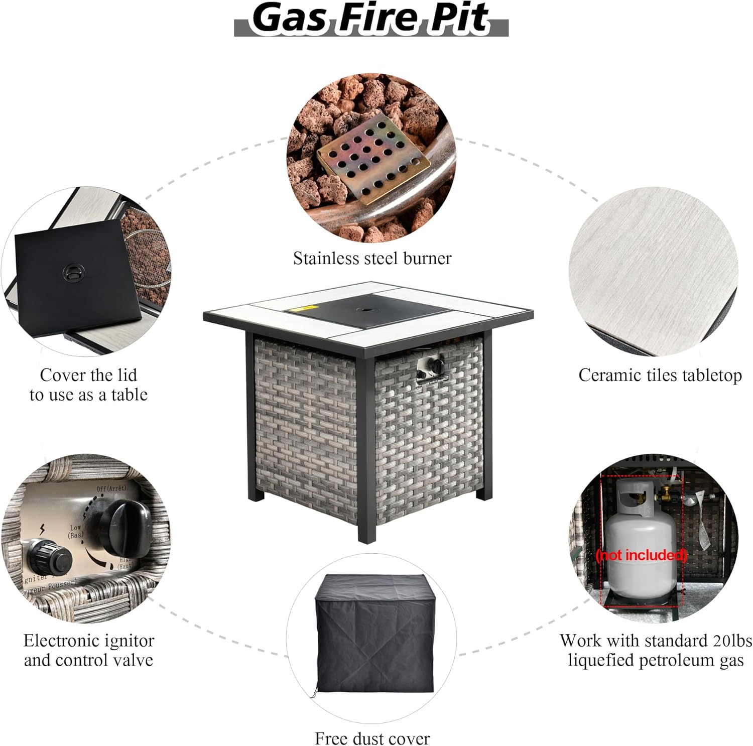• FirePit Table Included: Comes with a square convertible propane gas fire pit table. Night time use it as a fire pit table to add atmosphere. Day time use it as a tall Dining table with the burner lid. Stainless Steel Burner withstands all weather. CSA certificated for safety.