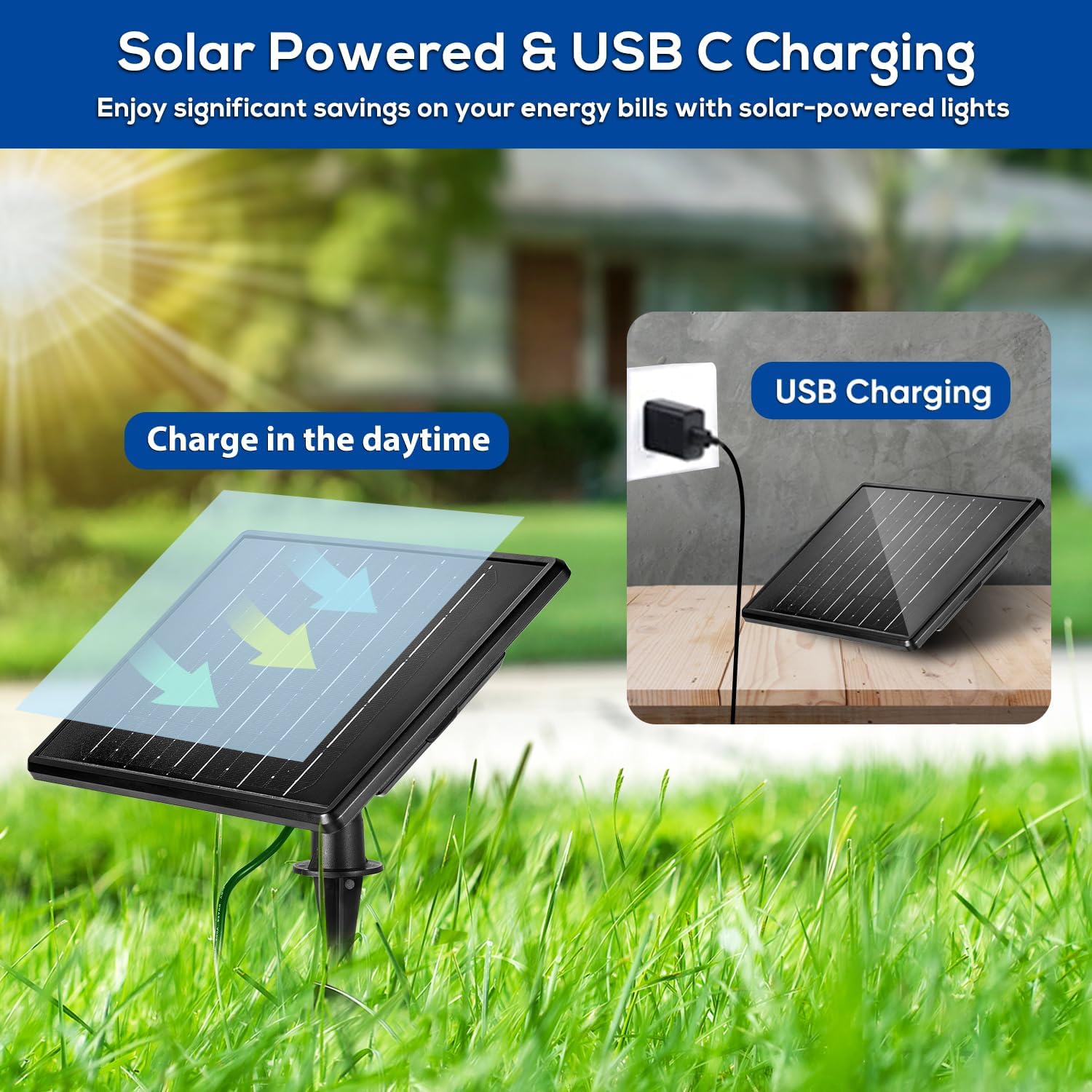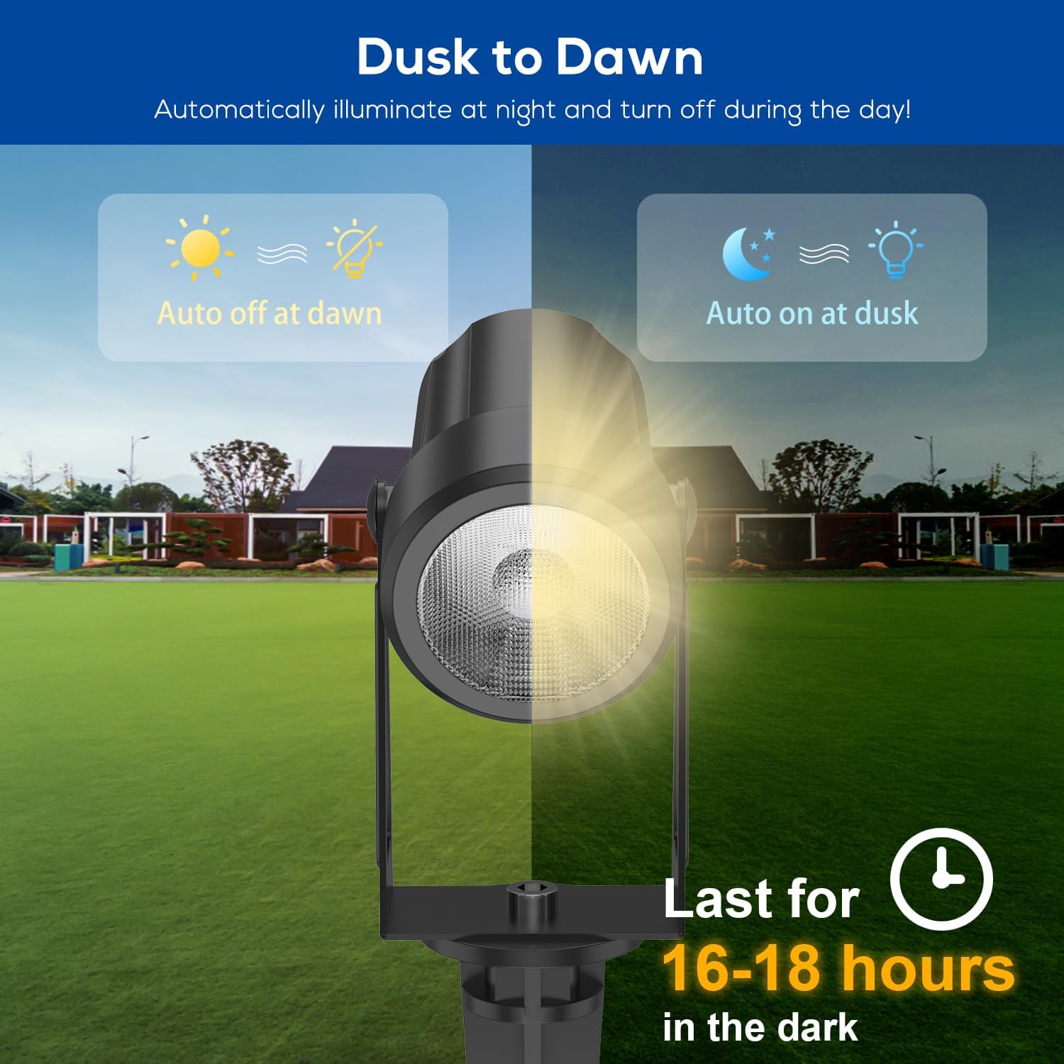 - 【Automatic On/Off & Adjustable Length】Equipped with Light Sensors, outdoor solar powered spot lights for yard garden automatically Turn On at Dusk and Off at Dawn. No need for manual operation, providing convenience and peace of mind. Providing an optional 13FT (2x6.5ft) Extension Cable (Sold Separately, ASIN: B0D174SZZ3 ).