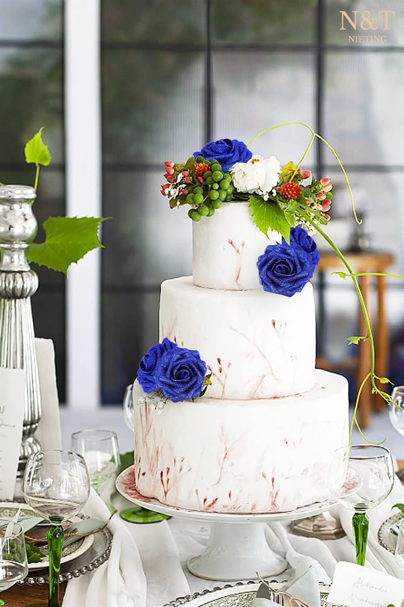 N&T NIETING Artificial Flowers Glowing Navy Blue Flowers Foam 50pcs Glitter Roses Real Looking Fake Roses with Stem for DIY Wedding Bouquets Centerpieces Bridal Shower Party Home Decorations