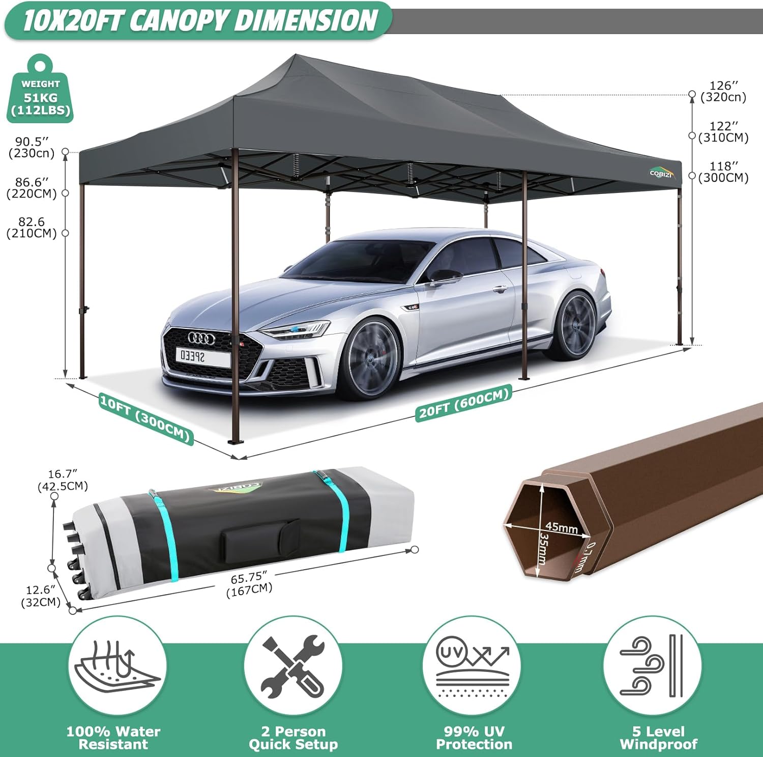 COBIZI 10x20 Pop Up Canopy Heavy Duty Without Sidewalls, Commercial Heavy Duty Pop Up Tent for Parties All Weather Waterproof and UV 50+ Wedding Tent with Roller Bag(Legs Upgraded),Grey