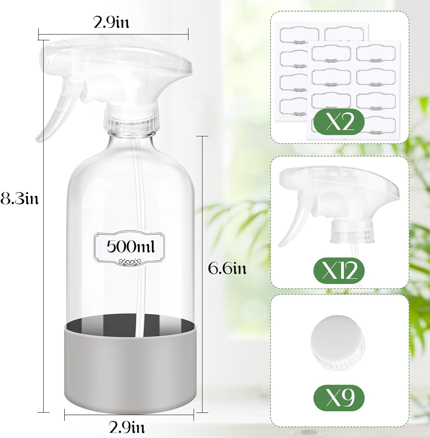 - Combo Containers Set: A complete package contains clear 16 oz bottles x 9, screw cone lids x 9, trigger nozzles x 12 and adhesive organizer labels x 16. You can place it on your livingroom or bathroom counter, sorting and labeling different liquid bottle at a glance