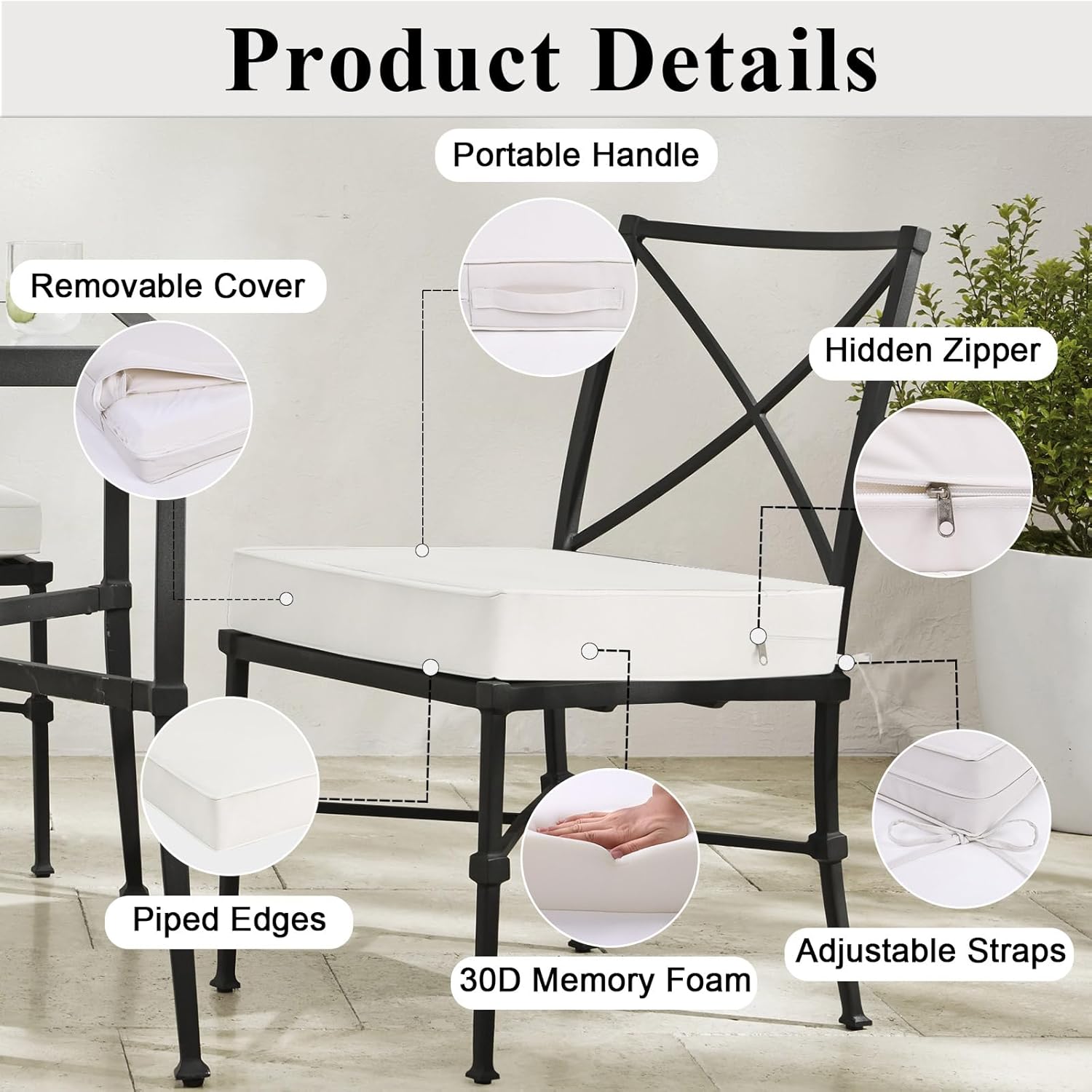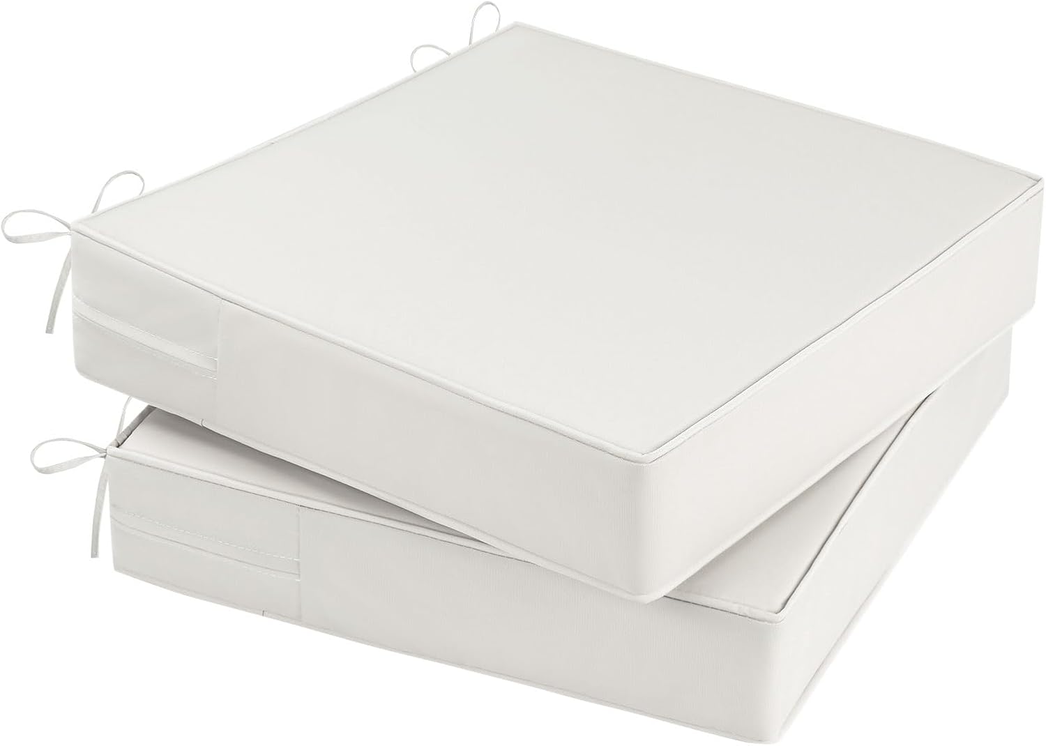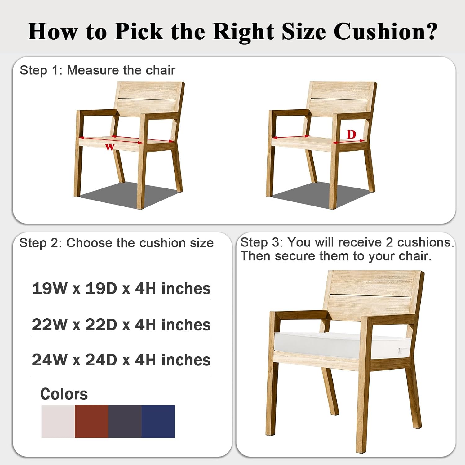 - PERFECT SIZE: Outdoor chair cushion set includes 2 cushions. Cushions measure: 19 inch (W) 19 inch (D) 4 inch (H). Fits most standard size outdoor chairs. Since the outdoor cushions are vacuum-packed, it may take 24-48 hours for the cushion foam to fluff back up after opening the vacuum bag