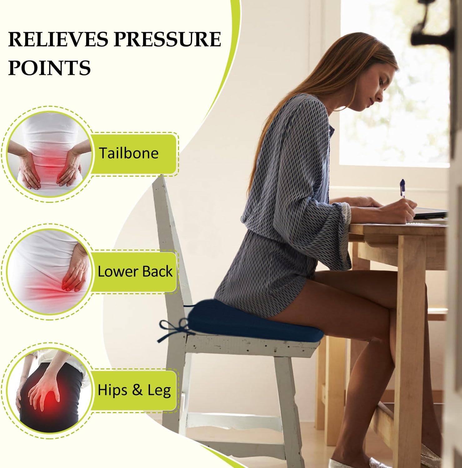 - Double Non-slip Design: Featuring 2 adjustable straps to secure the cushion to chair legs and a textured non-slip silicone base, these chair pads stay firmly in place on smooth surfaces. The dual anchoring system ensures stability, allowing you to sit comfortably without frequent readjustments