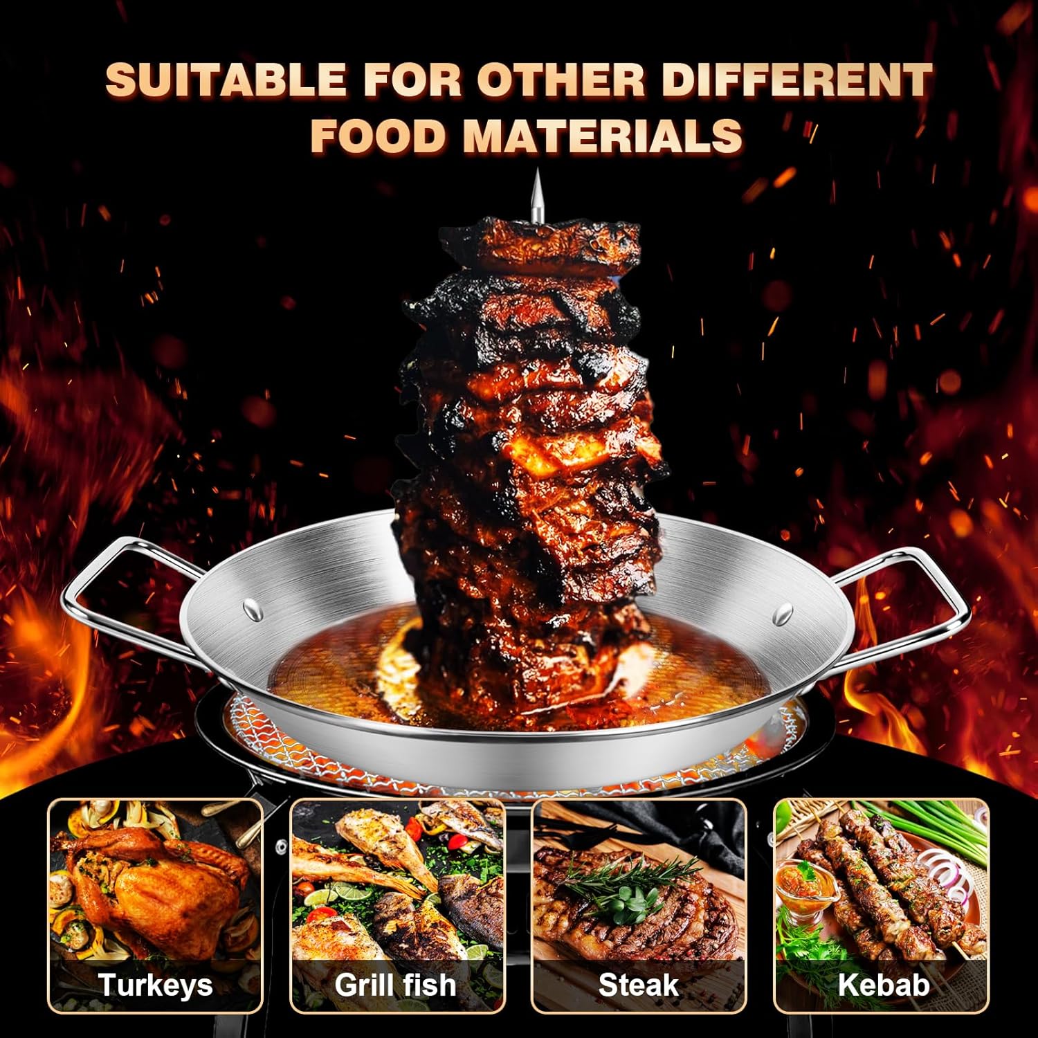 Stainless Steel Al Pastor Skewer & Gyro Pan for Grill – BBQ Vertical Skewer Pan Set with 3 Removable Spikes (8”/10”/12”), Brushes & Tongs, Brazilian Spit Stand for Tacos, Shawarma, Kebabs, Oven
