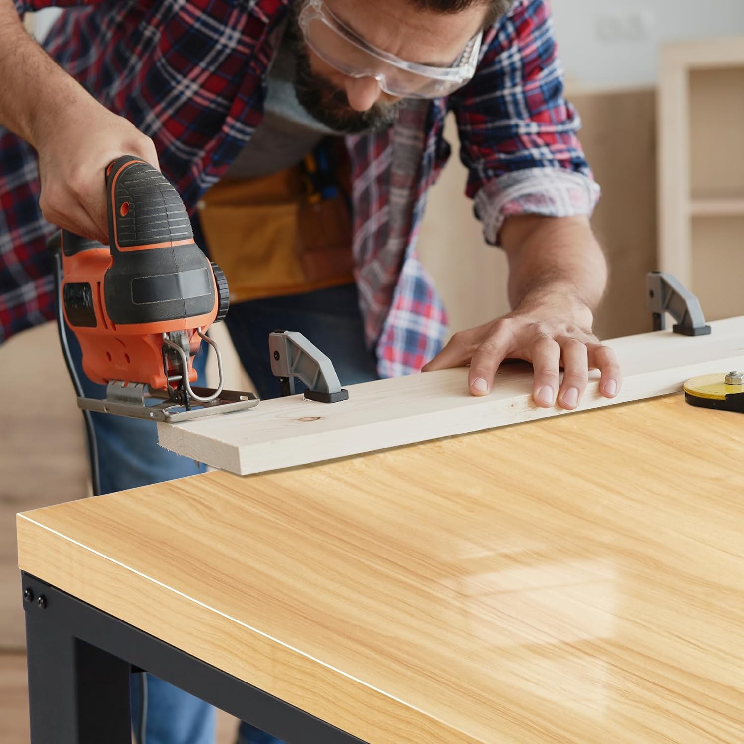 - Heavy Duty Work Bench: Constructed of high quality materials, the workbench consists of a 1" thick wood board tabletop and black textured steel frame that withstands powerful impacts up to 2000 lbs