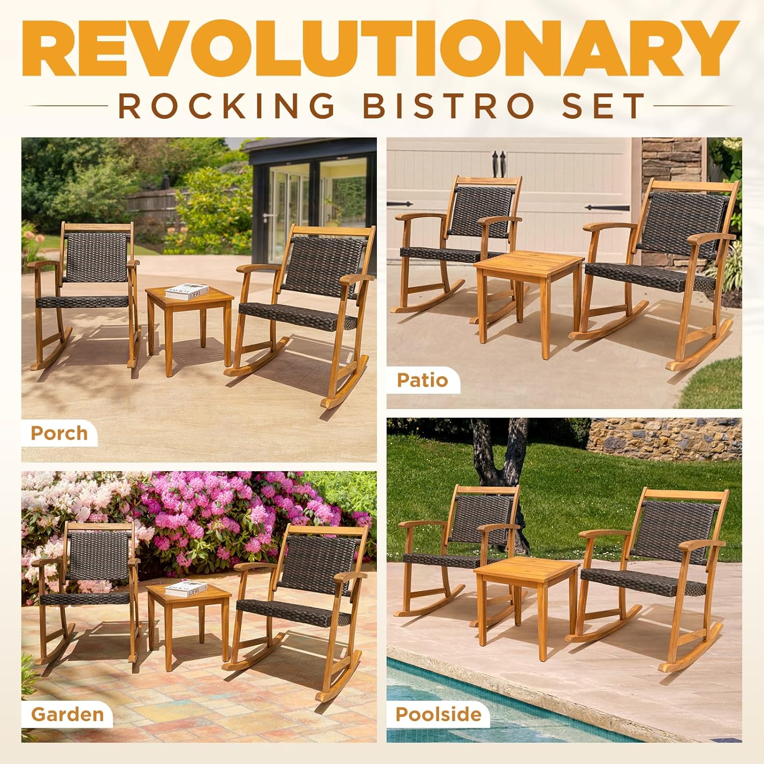 - 『HEAVY-DUTY ROCKING BISTRO SET』: Our bistro set 3 piece outdoor is built to last, with a sturdy wooden frame holding 400lbs for chairs and 220lbs for the table. Its rocking design for better comfortable, ideal for any outdoor event or having a sip with friends & family