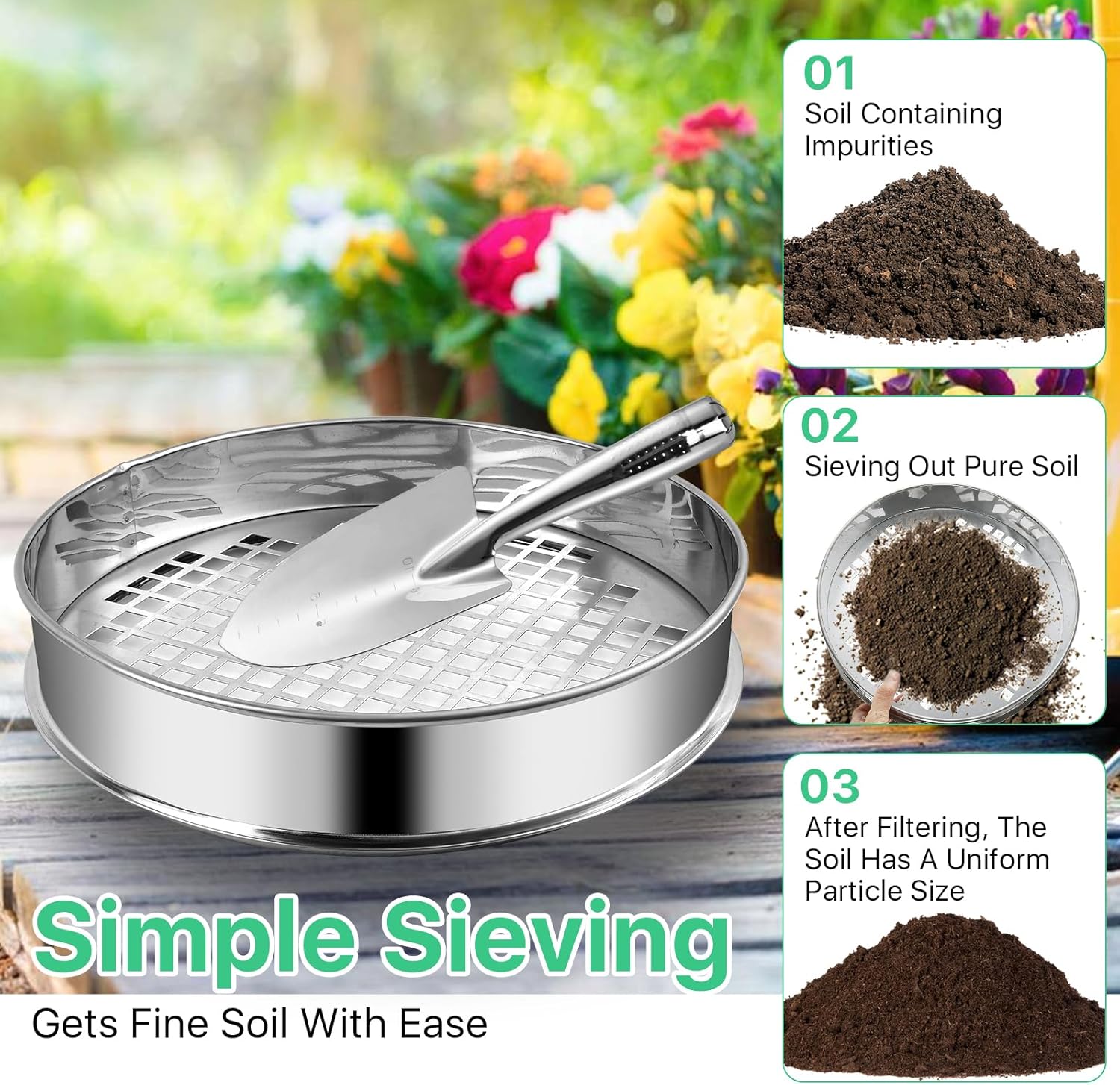 - Quality Material - Our soil sifter and shovel set is made of quality stainless steel, which is sturdy and long lasting and can be used for a long time without rust, corrosion, breakage, deformation or bending, ensuring your gardening work goes smoothly