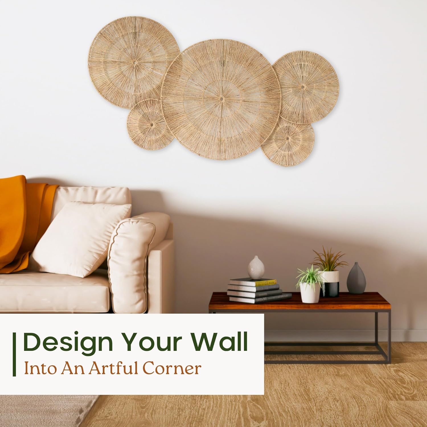 CHI AN HOME 18 Inch Boho Wall Decor β Set of 5 Woven Jute Wall Baskets, Boho Wall Art & Decorative Basket Set, Farmhouse Wall Hanging, Handwoven Wall Plates for Living Room, Bedroom β 18", 14", 11", 8", 7"