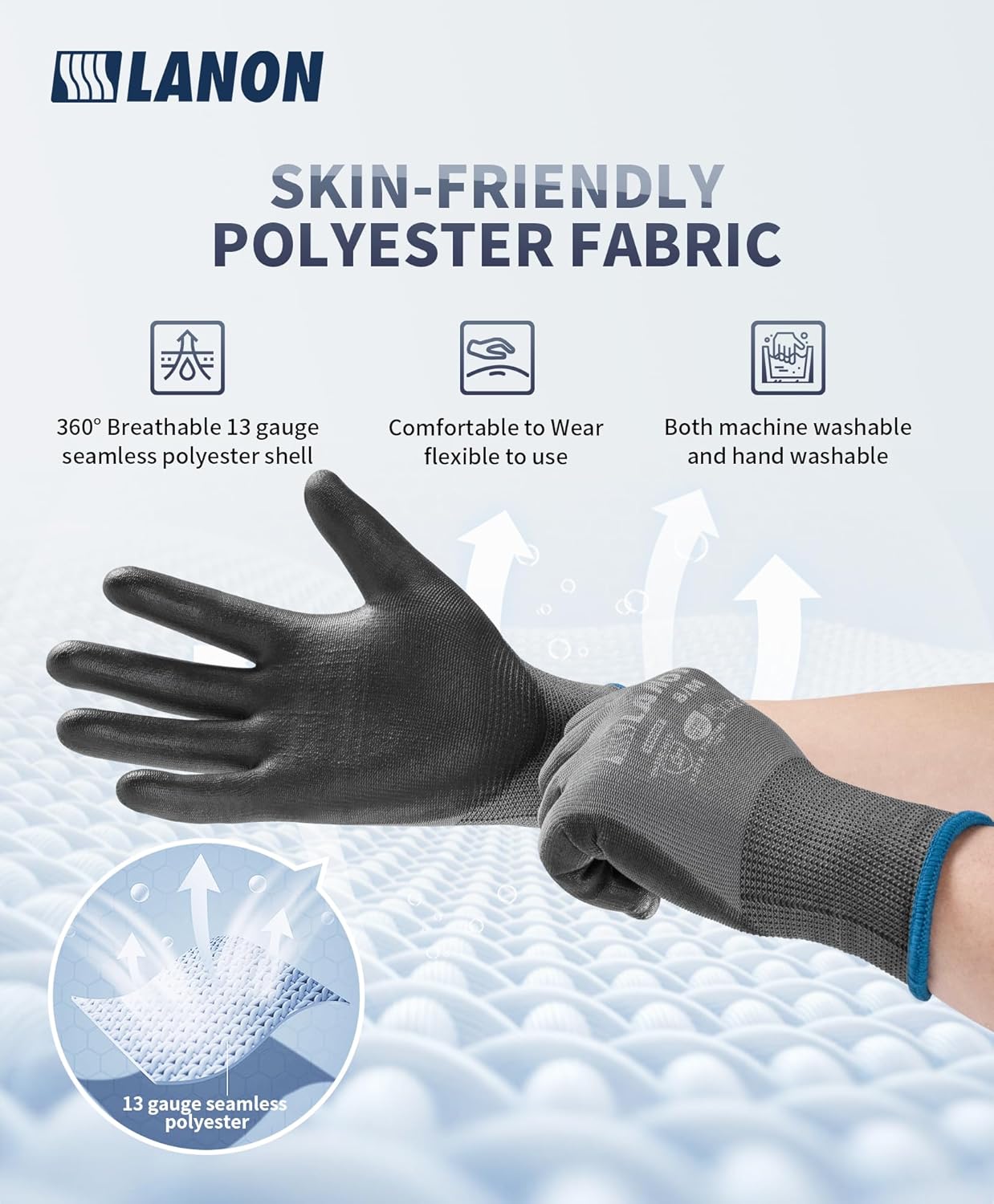 LANON 18 Pairs Safety Work Gloves, Mechanic Working Gloves for Men,Breathable PU Coated, Seamless Knit,Double Wash, Grey, XXL