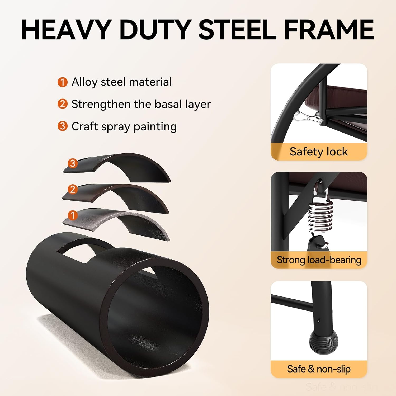 - 【760LBS STABLITY】The FUNG YARD Porch Swing has a strong and steel frame, with a weight capacity of up to 760 pounds. It has sturdy steel fittings, hooks, and seat tubes for stable support. The Patio Swing also has heavy-duty spring steel for smooth and gentle swinging motion.