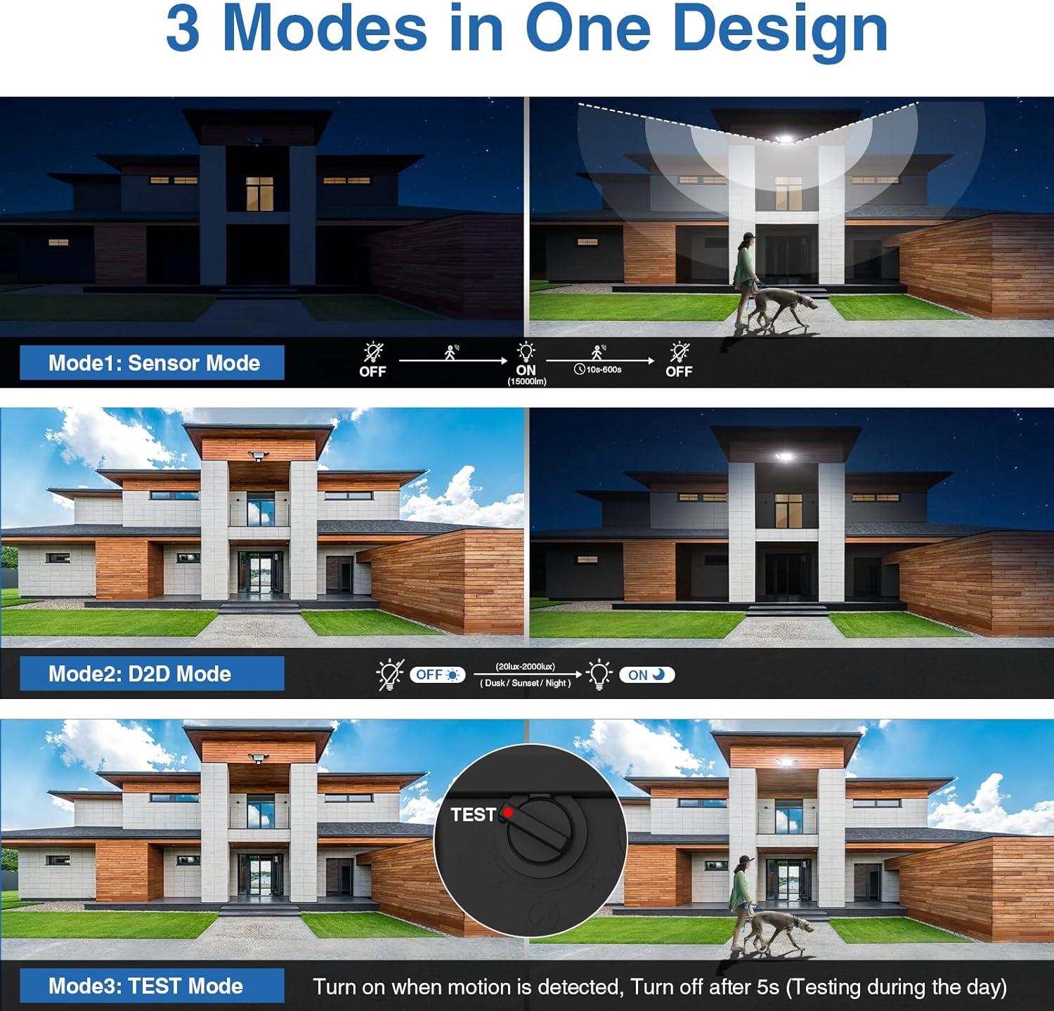- 【3 Lighting Modes】Mode1: Sensor Mode, turns on when motion is detected. Mode2: D2D (Dusk to Dawn) Mode, automatic turn on at night, automatic light off during the day. Mode3: TEST Mode, turn on when motion is detected, Turn off after 5s.