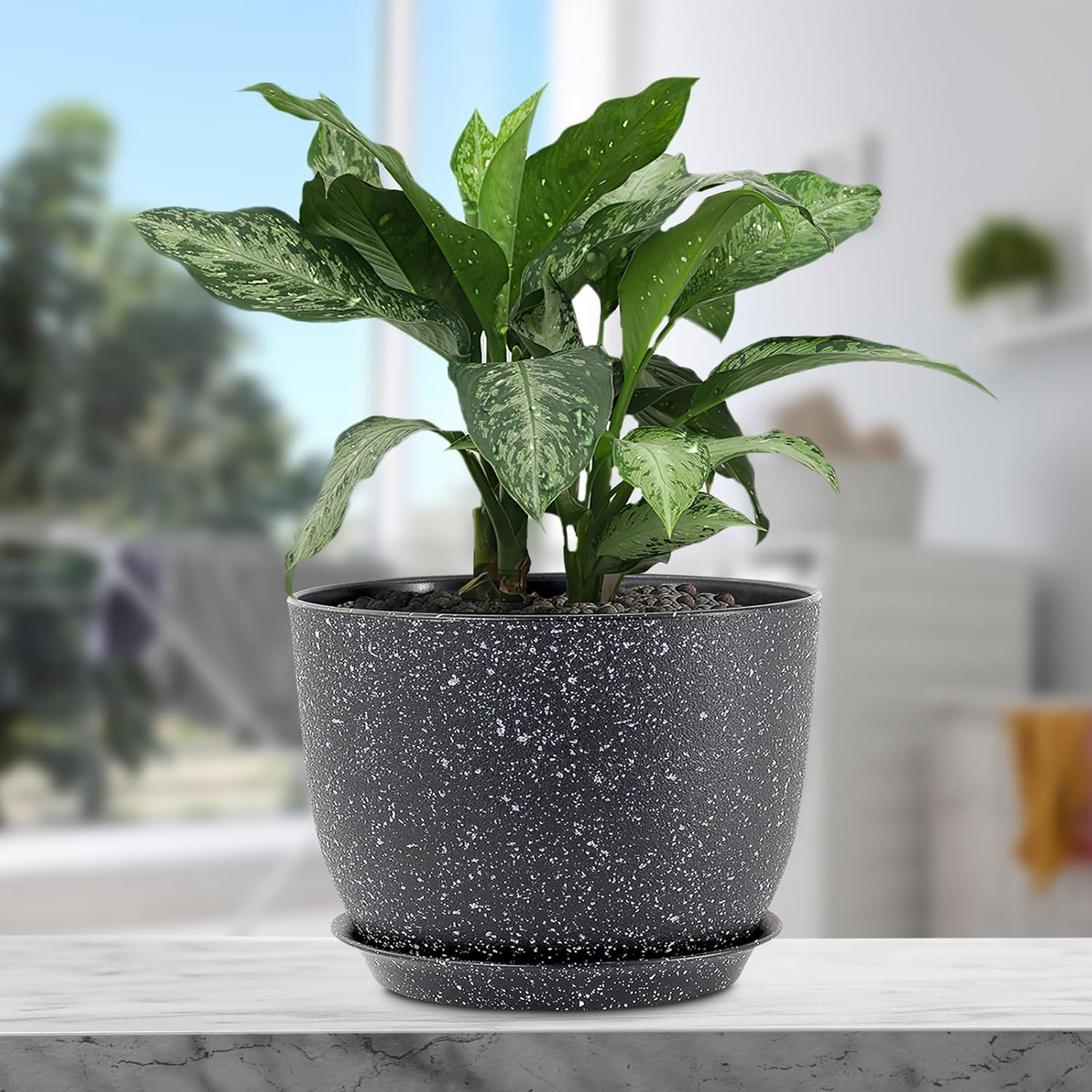 12 inch Big Plant Pots, Plastic Planters with Drainage Holes and Trays, Large Flower Pots for Indoor Outdoor Plants, Modern Decorative Pots for Garden House Plants, Speckled Black