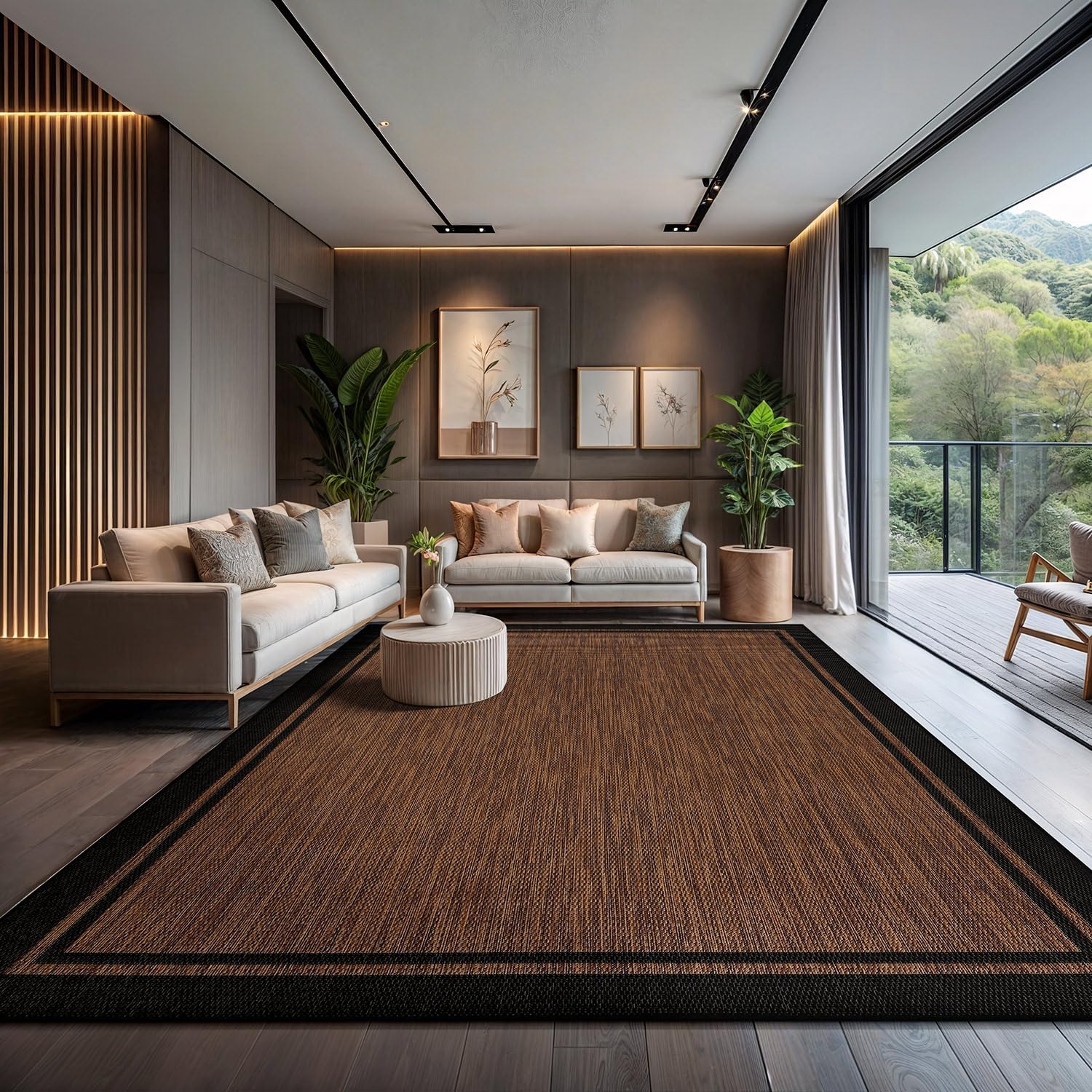 CAMILSON Indoor Outdoor Rug, 9x12 Bordered Nut Brown Black Modern Area Rugs for Indoor and Outdoor Patios, Kitchen and Hallway Mats, Washable Porch Deck Outside Carpet (Border Nut Brown Black, 9 x 12)