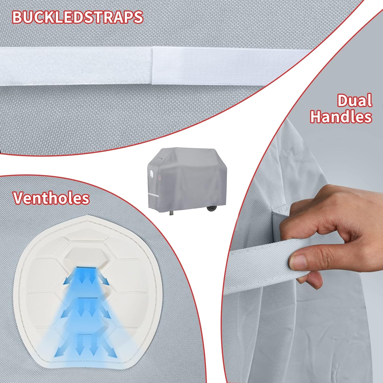 - 【Feature】- Durable handles and straps on both sides for fixing the cover. Handles provide convenience for fitting and removal. Straps help tighten and prevent the cover from being blown off. The air vent hole would ensure that your gas grill wouldn't become dirty and keep dry.