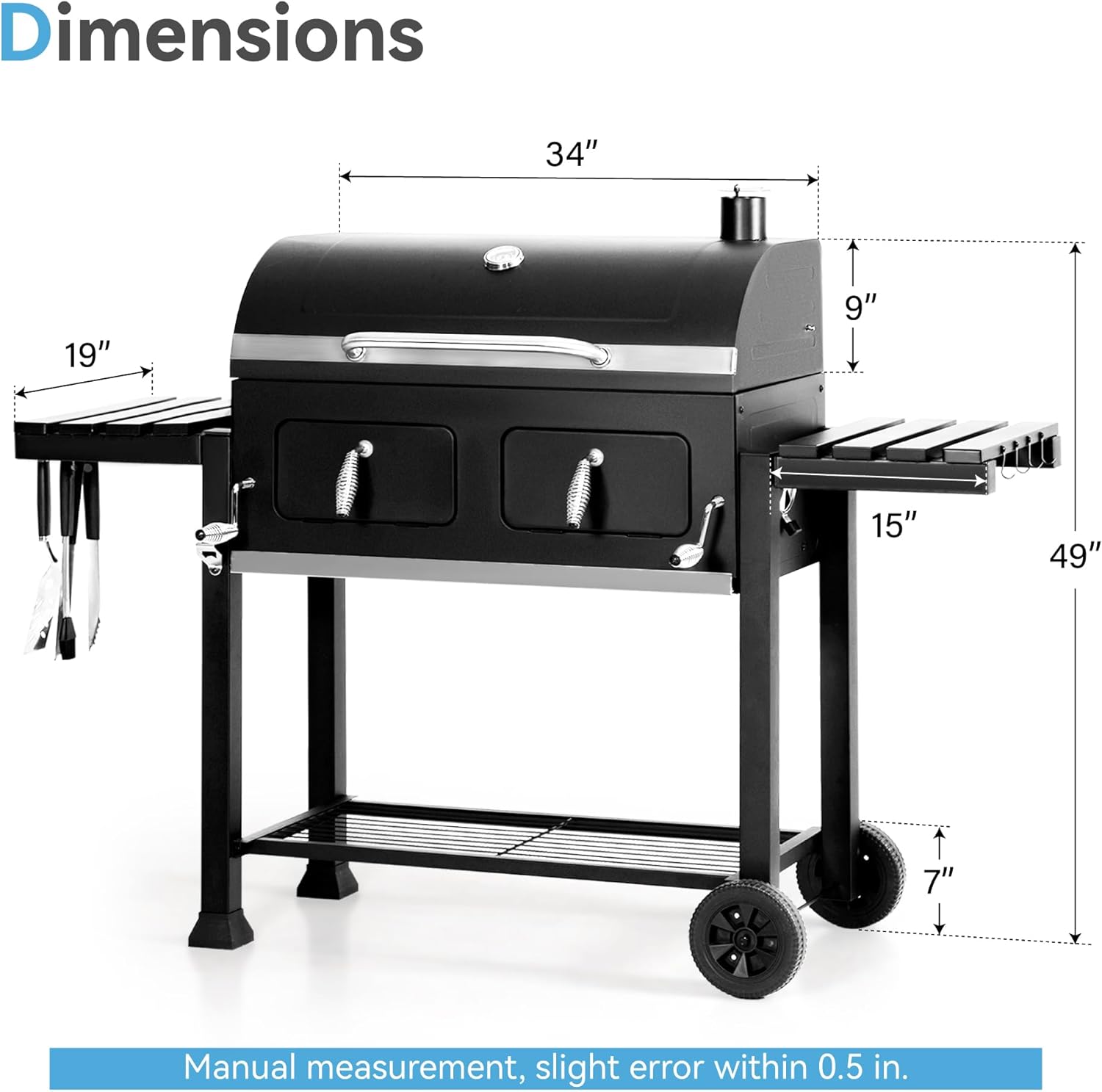 - DISTINCTIVE DESIGN: The lid-mounted temperature gauge instantly displays temperature changes; the dual side damper design maximizes airflow for efficient burning and temperature control, while the smoke stack with an adjustable cap allows for additional airflow