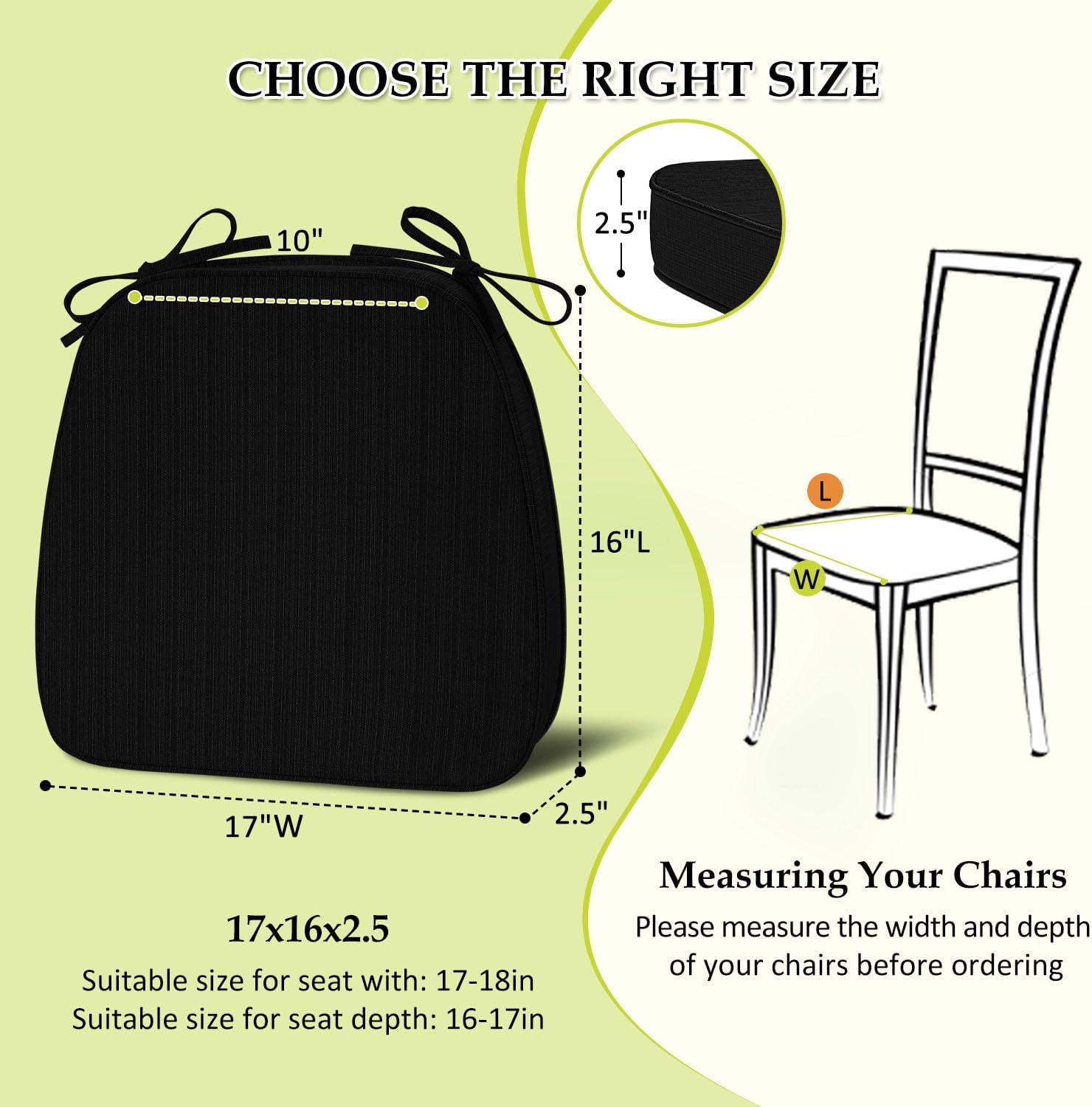 - Size Guide: These dining chair cushions measure 17" (L) x 16" (W) x 2.5" (H), designed to fit most standard dining chairs. They offer a practical solution to refresh your dining decor. Note: We recommend measuring the width and depth of your chair seat before purchasing to ensure a proper fit
