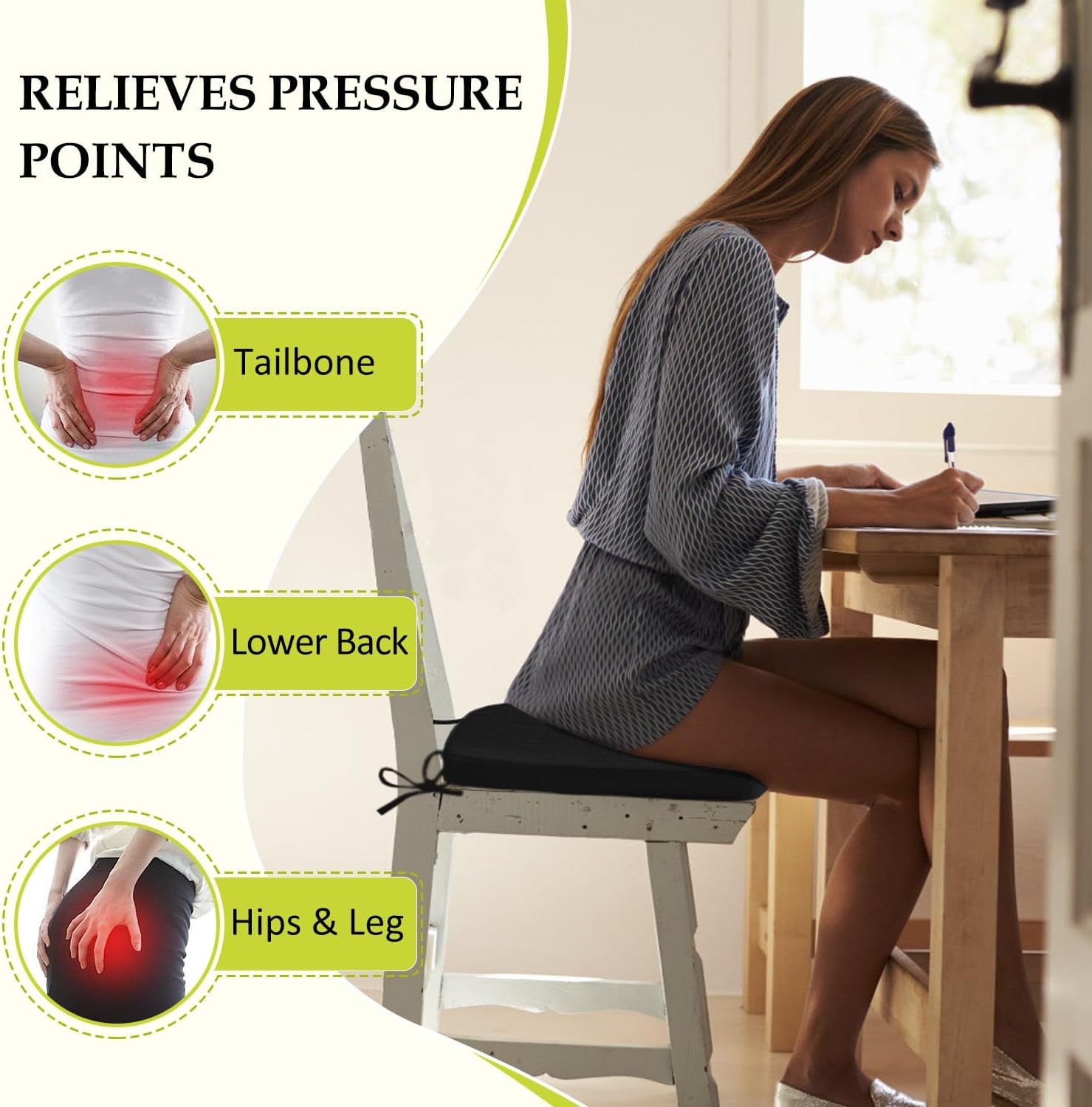 - Double Non-slip Design: Featuring 2 adjustable straps to secure the cushion to chair legs and a textured non-slip silicone base, these chair pads stay firmly in place on smooth surfaces. The dual anchoring system ensures stability, allowing you to sit comfortably without frequent readjustments