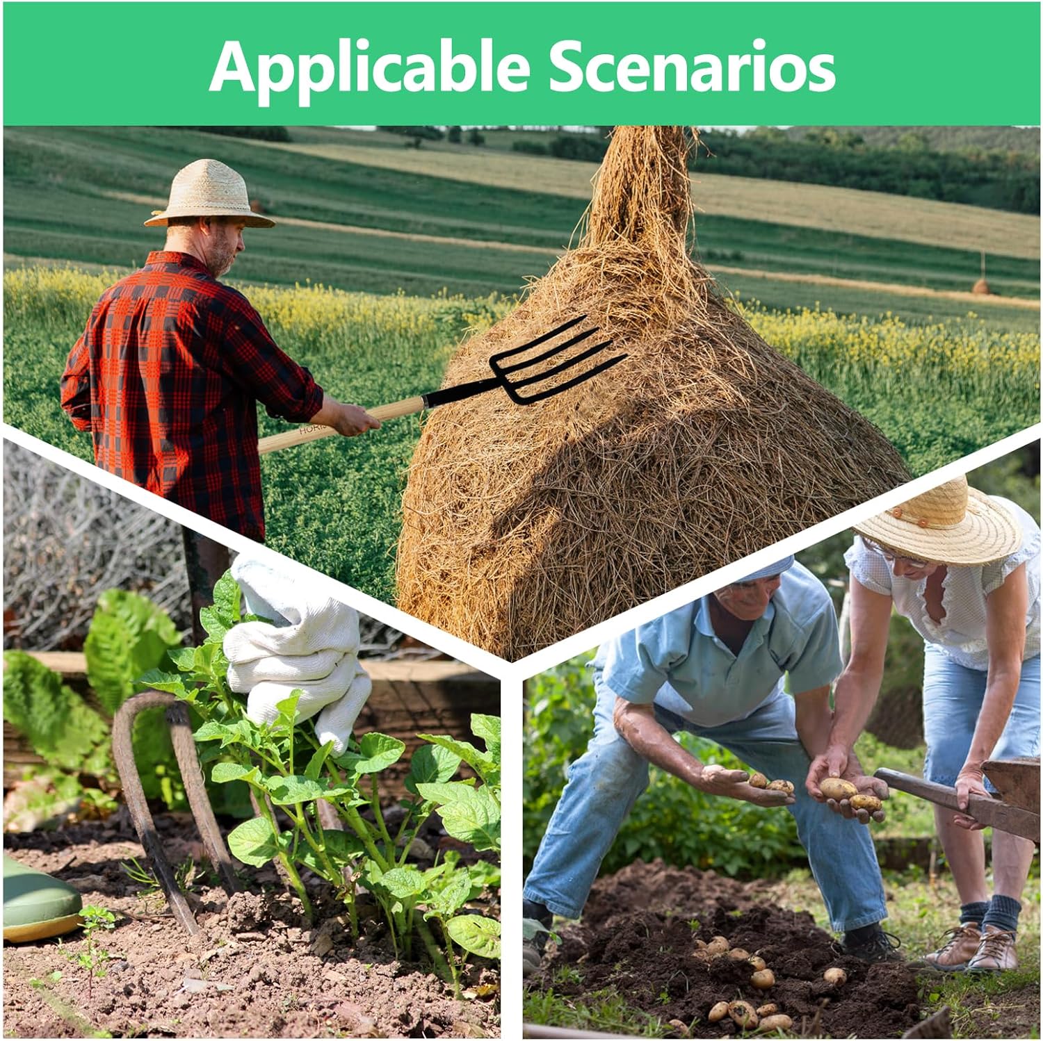 - Multi-Use:The sharp V-shaped tines of the digging fork can quickly penetrate hard soil,Pitchforks For Gardening Suitable For Loosening The Soil, Moving Mulch, Leaves, Straw, Hay Or Garden Debris, Turning Over Compost, Soil And Digging Potatoes Garlic.
