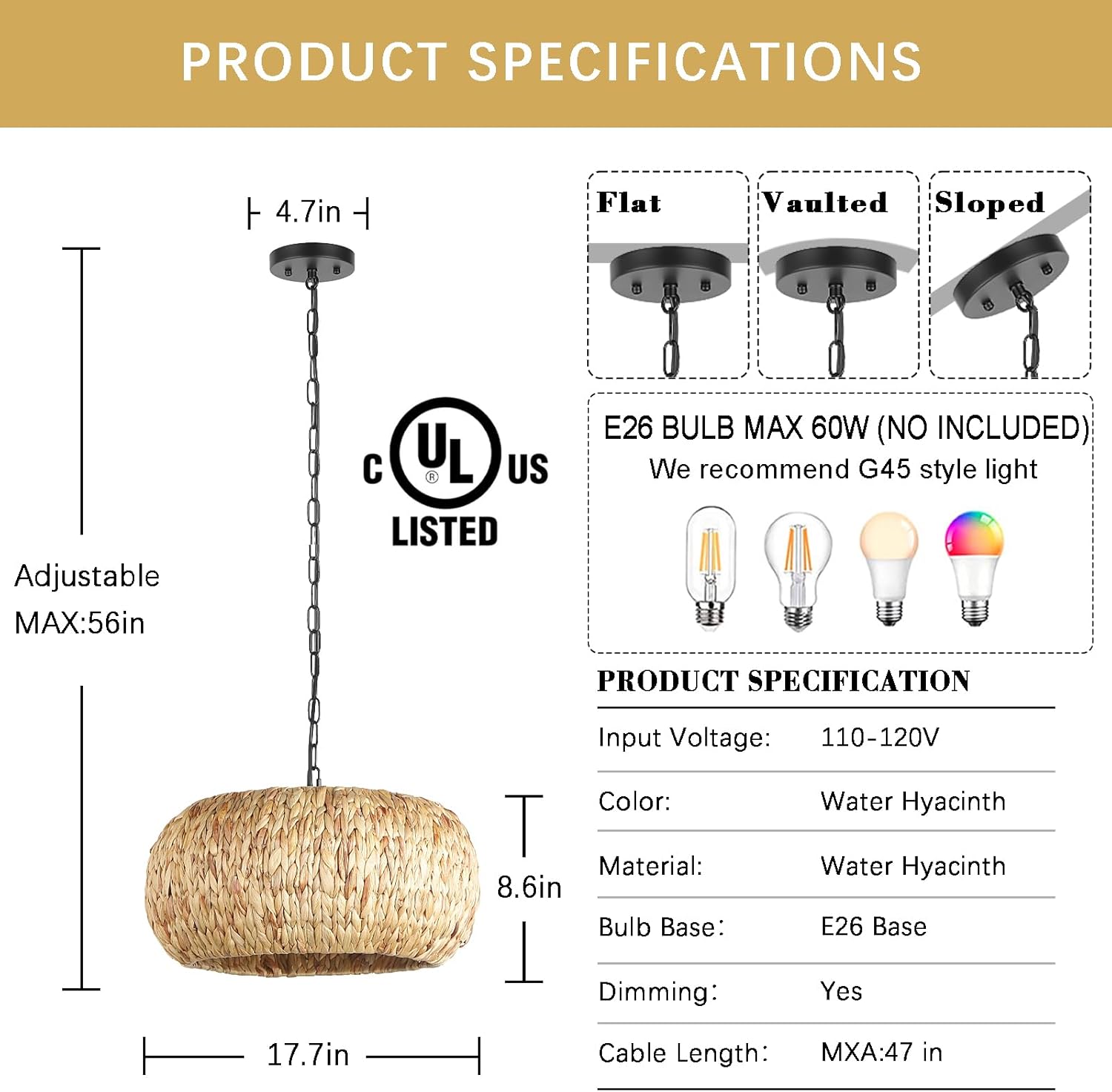- ⭐【Easy installation】This rattan hanging light apply UL Listed E26 standard sockets (Max 60W), compatible with incandescent, LED, CFL, and halogen bulbs (Bulb Not Included). The light fixtures ceiling hanging includes all installation accessories. Easy to assemble and use, makes your life much easier.