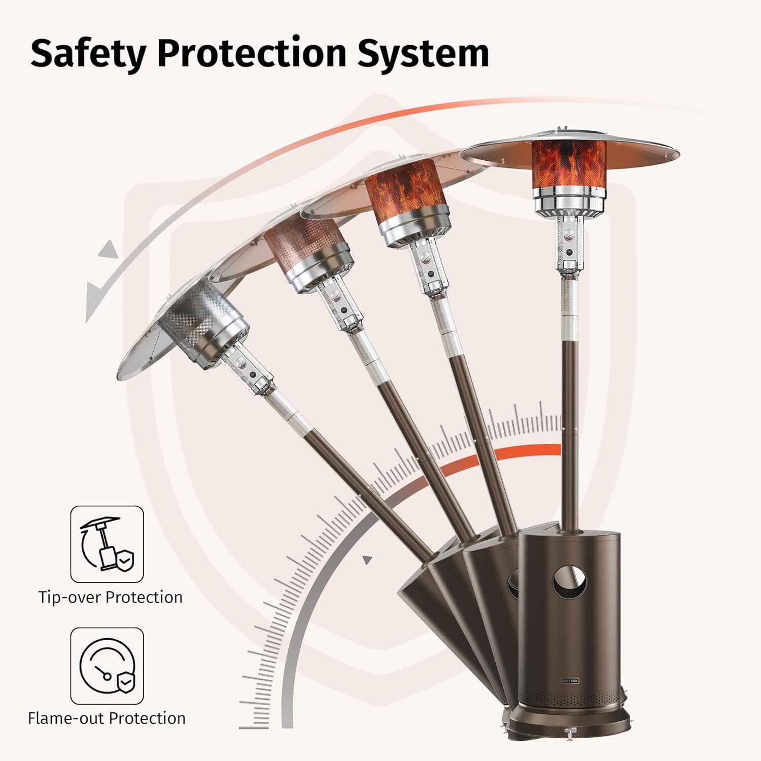 - ๐๐ผ๐๐ฏ๐น๐ฒ ๐ฆ๐ฎ๐ณ๐ฒ๐๐ ๐ฃ๐ฟ๐ผ๐๐ฒ๐ฐ๐๐ถ๐ผ๐ป ๐ฆ๐๐๐๐ฒ๐บ: The Tip-over Protection system will shut off the flame when the patio heater propane is tilted more than 45 degrees. If the flame goes out, the Flame-out Protection system automatically shuts off the gas supply