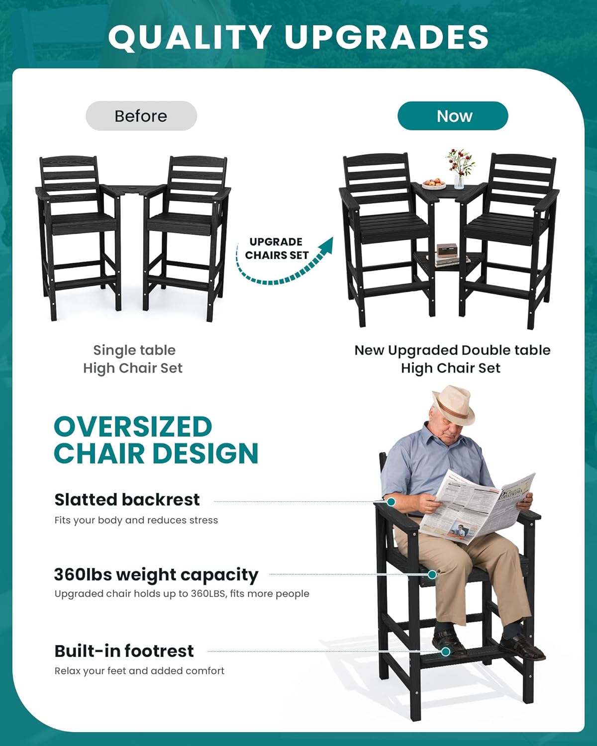 SERWALL Tall Adirondack Chairs Set of 2 with Connecting Table, All Weather Outdoor Barstools, Black