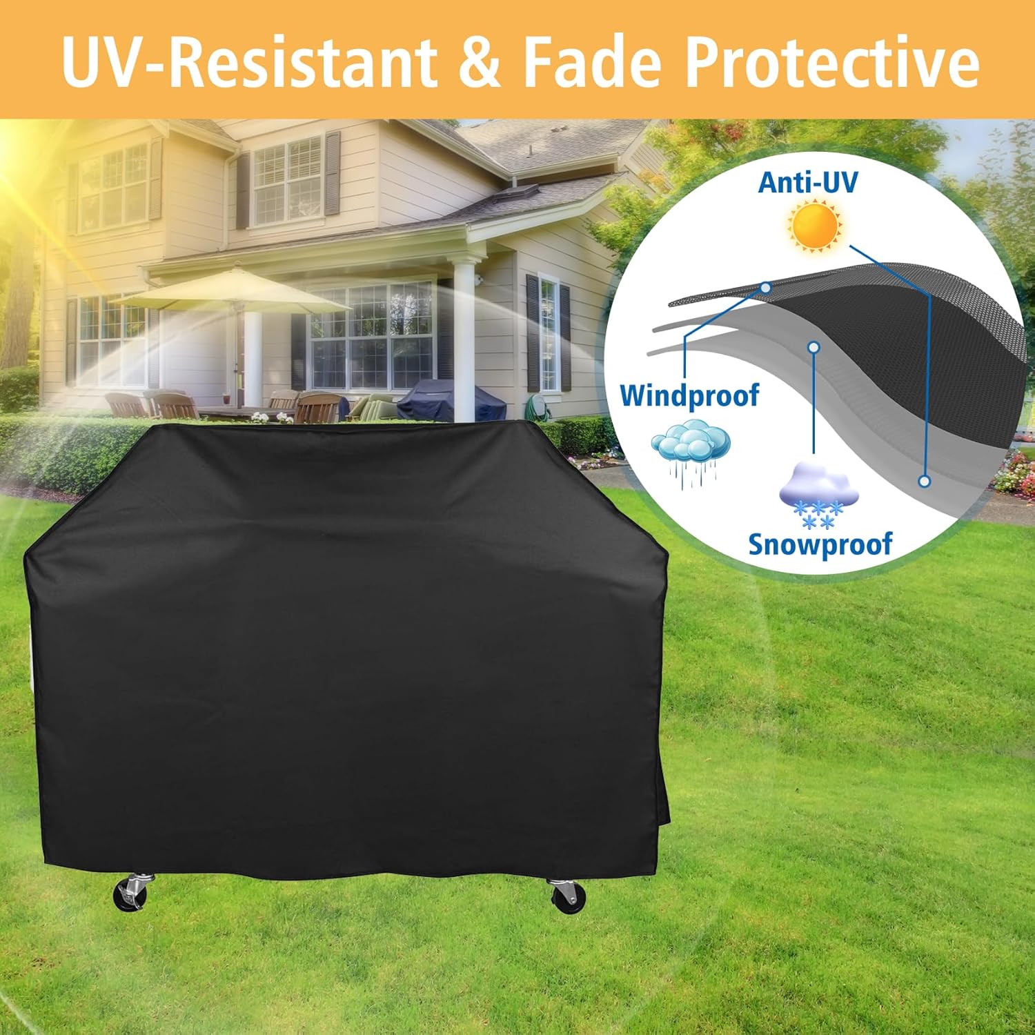 - Material: The Royal Gourmet waterproof grill cover is made of 600D high-density oxford fabric with an internal PVC coating, can protect your grill from strong winds, storms, sunlight, snow, dust, and debris, durable and long-lasting. Has good UV resistance, color fastness, waterproofing, low temperature resistance, and tear resistance functions.