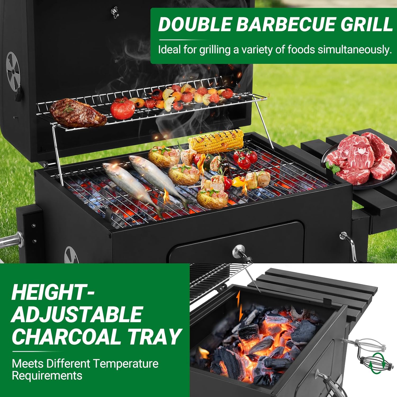 - 【CONVENIENT DESIGN】This heavy duty extra large bbq charcoal grill has cool-touch metal handle on the front cover where you can add fuel while cooking without having to move the food or remove the grills. Full-size push out ash pan is removable for quick and easy clean-up ashes.