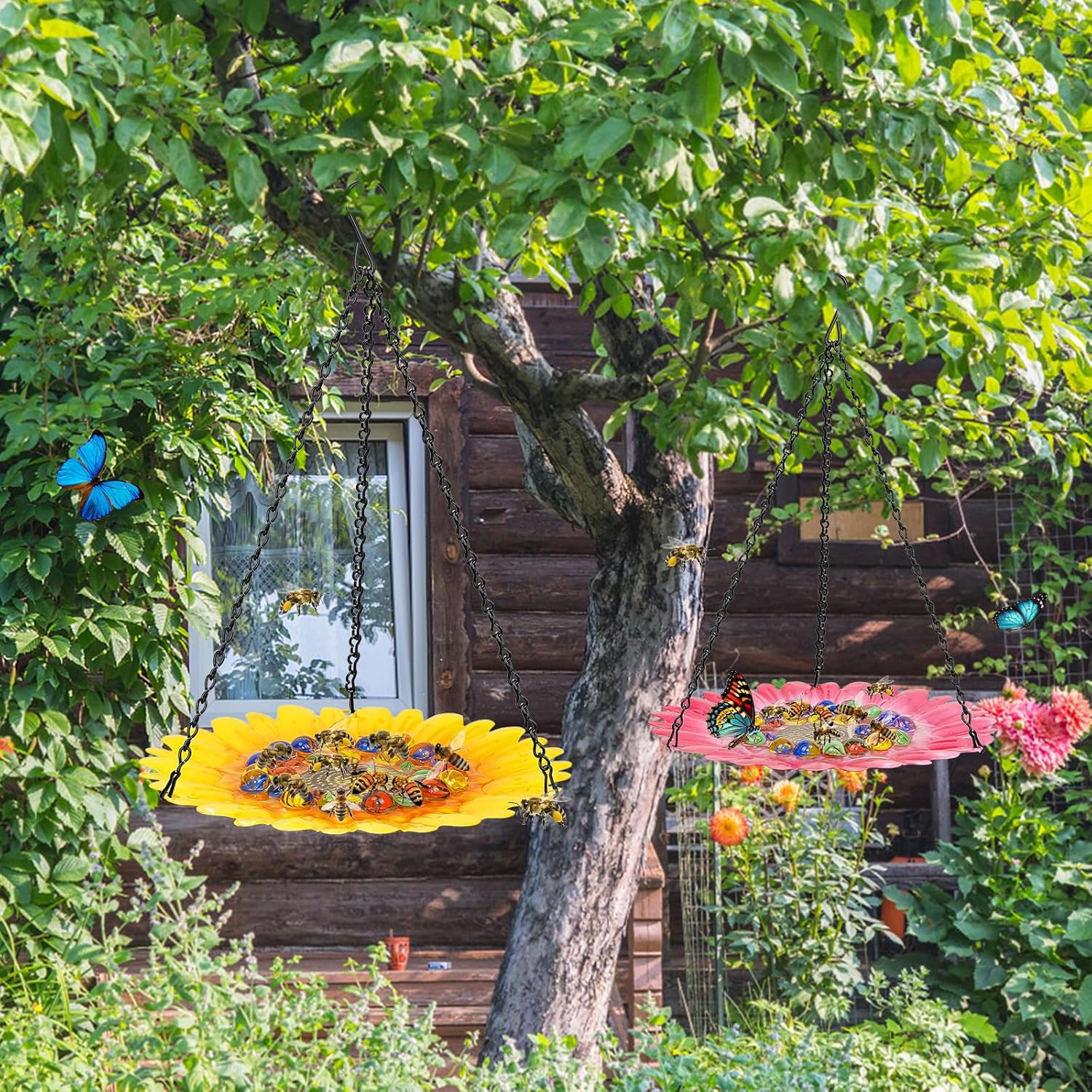 Bee Watering Station for Garden, Bee Bath Feeders for Outside with Vivid Flower Design, Hanging Butterfly Bath Bowl with Glass Balls for Outdoor Courtyard Decoration (2Pcs-Yellow)