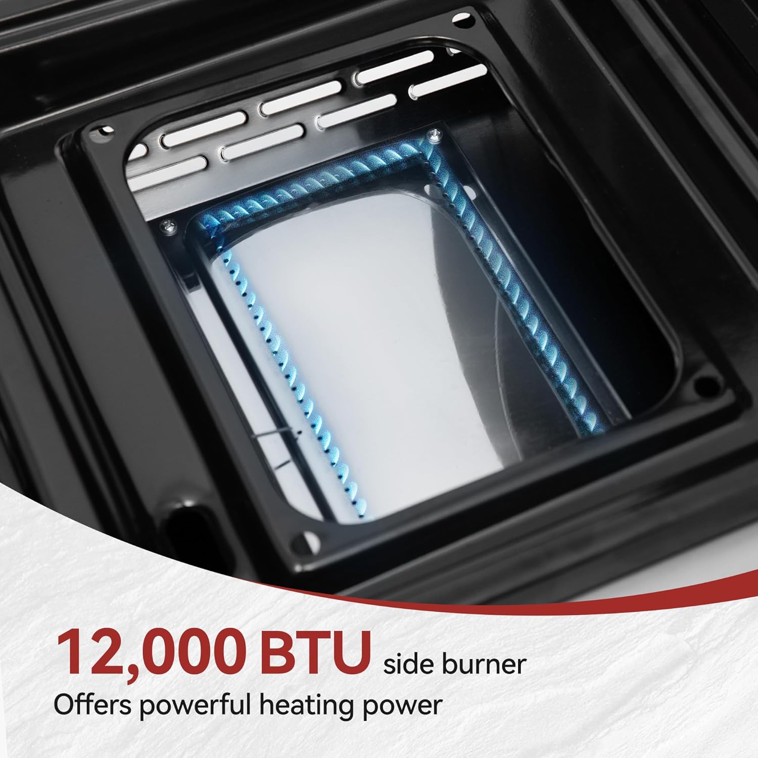 - Powerful & Functional Design: Experience 29,000 BTU Power (2 x 8,500 BTU main burners + 12,000 BTU side burner). Features include a Side Burner Lid (cover/shelf, 10 lb. max load capacity), Griddle Lid (protection/wind guard), Easy Cleanup (removable grease cups), and Battery-free Operation (piezo ignition)