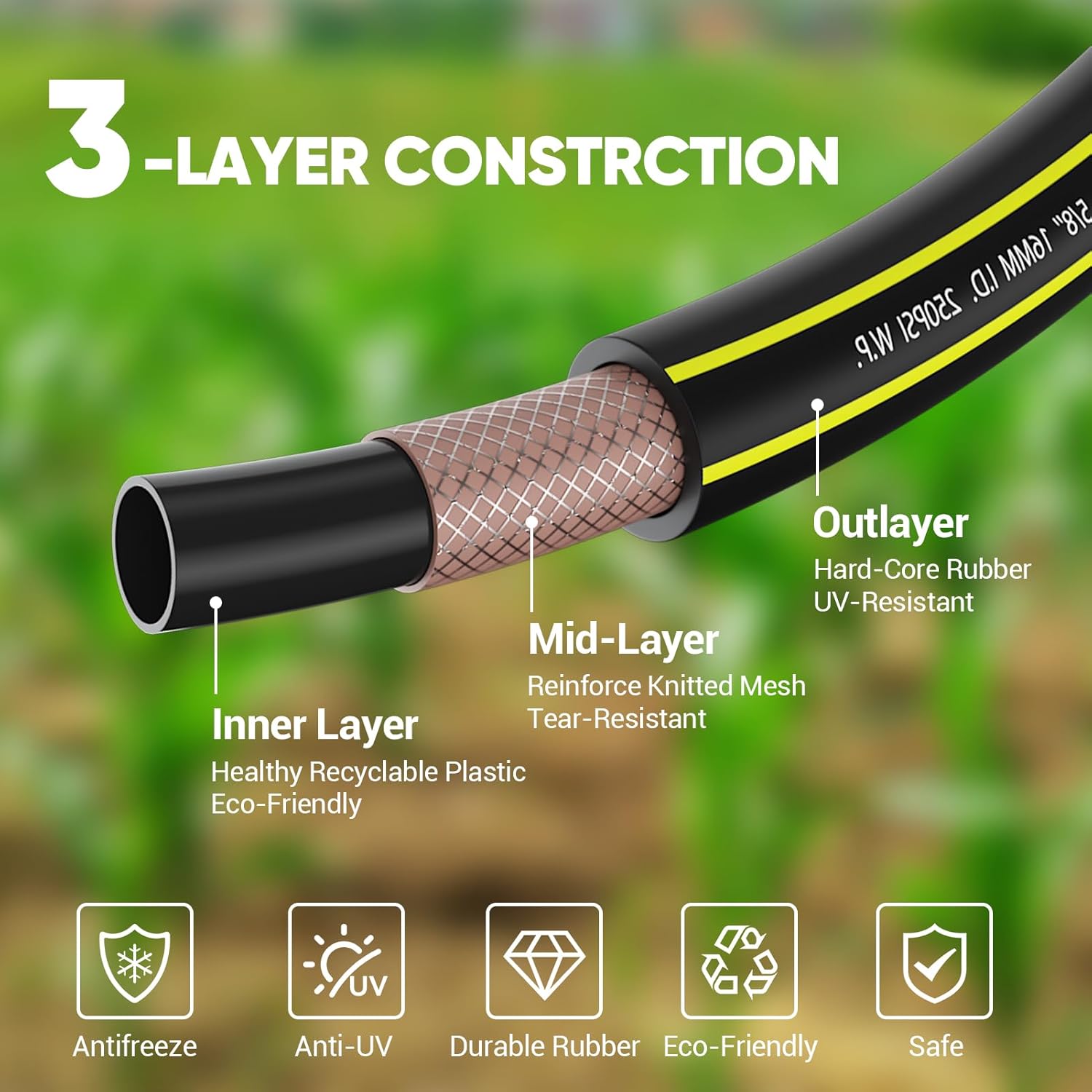 - ๐กใ๐๐๐ซ๐-๐๐จ๐ซ๐ ๐๐๐ซ๐๐๐ง ๐๐จ๐ฌ๐ใ: Upgraded premium 3-layers deisgn, OUTLAYER made with hard-core rubber, MID-LAYER made by mesh structure reinforce knitted ensure no tearing&high pressure, healthy recyclable plastic INNERLAYER makes sure water flow clean&smooth. With solid Heavy duty full brass fittings, PHLEX PRO garden hose is life-time durable, Tear-Resistant, UV-Resistant, Weather-Resistant.