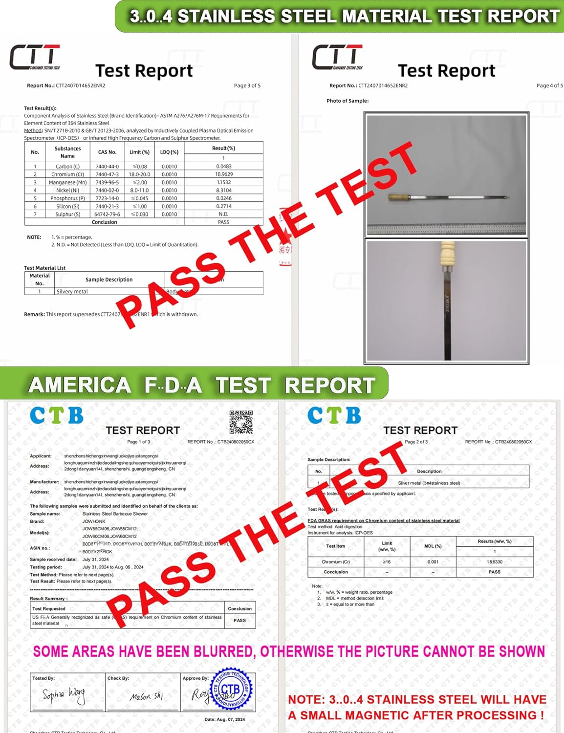 - 【304 STAINLESS STEEL HAS WEAK MAGNETISM】304 stainless steel may have weak magnetism because during the processing and forging process of the product, a small amount of austenite is converted into martensite, so 304 stainless steel may have a little magnetism,which is a normal phenomenon.We have America F..D..A test report and 304 stainless steel material test report, you can buy and use securely.