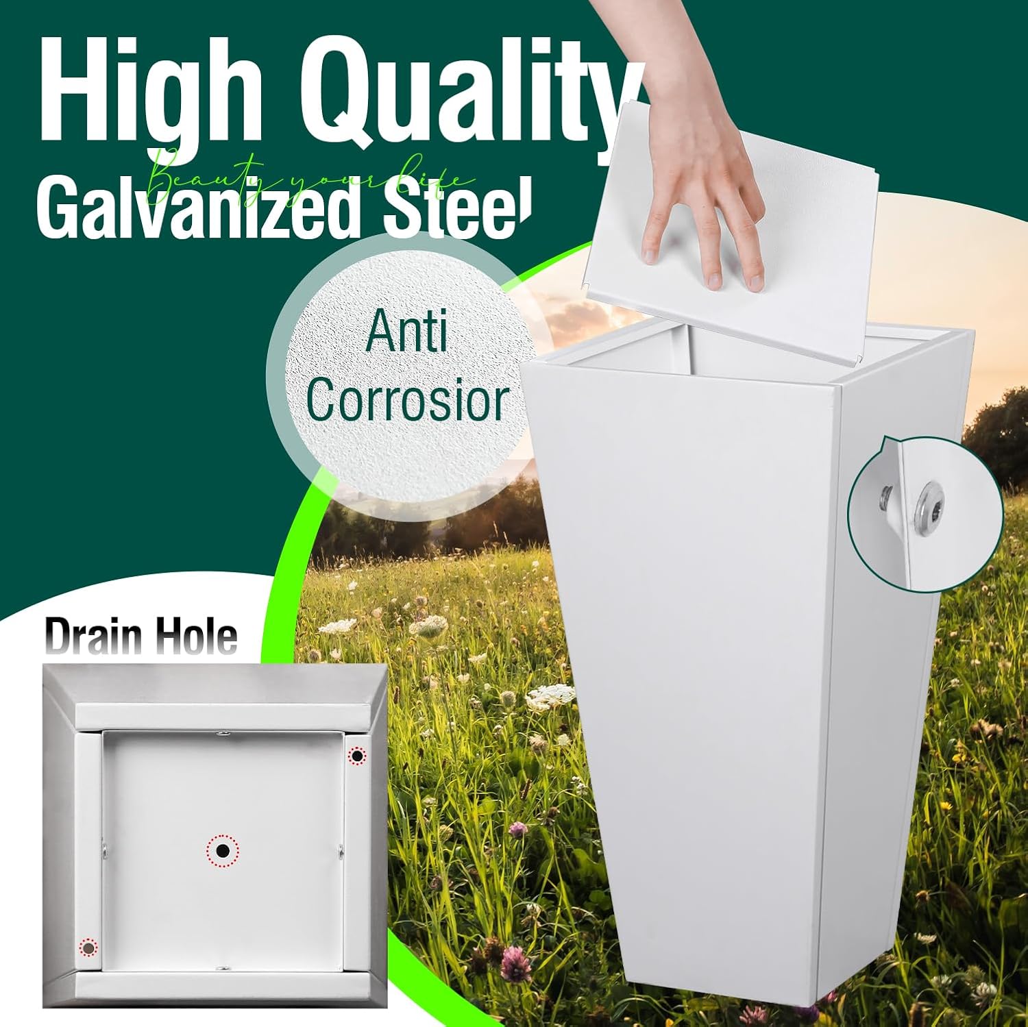 - Tall Planters for Outdoor Plants: Galvanized planter box is made of galvanized steel with white powder coating. Galvanized Steel Planter is wear-resistant, corrosion-resistant and long lifetime