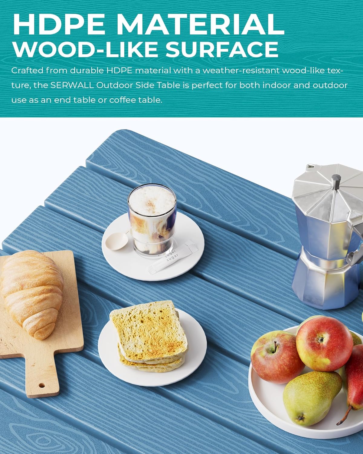 - [Premium Wood-Textured Surface] Offering the aesthetic appeal of wood without the upkeep, the SERWALL Side Table features a wood-textured HDPE surface that adds an elegant and natural touch to your outdoor decor.