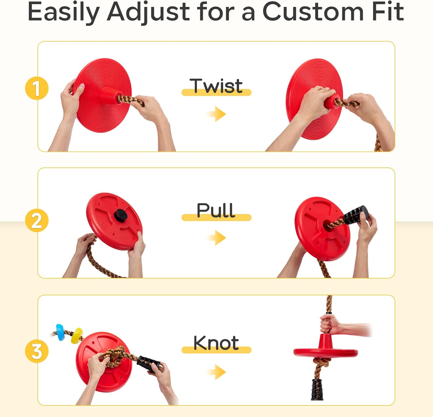 DECORLIFE Adjustable Rope Swing for Kids, Climbing Rope Disc Swing with Platforms, Carabiner and Tree Strap, Tree Swing for Outdoor, Swing Set Playground Accessories, Red