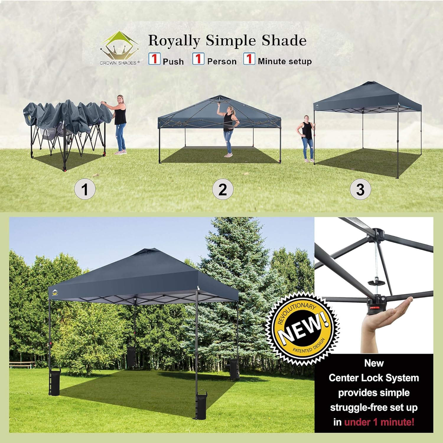 - ONE BUTTON EASY SET UP - Our 10x10 pop up canopy tent features patented one push center lock tech. With just a single push, the central hub locks the poles in place. Designed for the next generation, this outdoor canopy for patio can be set up by two people in seconds without any tools. Three adjustable height settings with soft, pinch-free buttons ensure convenience and safety, making it perfect for camping, beach outings, craft fairs, tailgating, farmer markets, outdoor BBQs, and more.