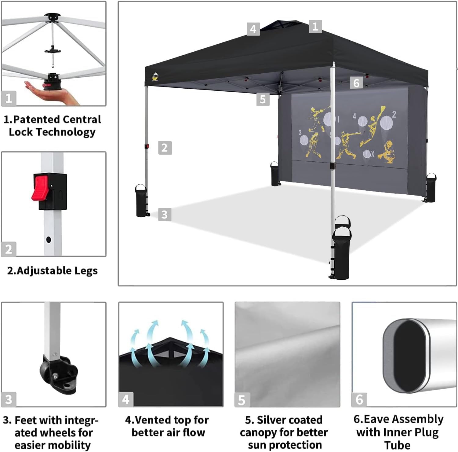 - ONE BUTTON EASY SET UP - Our 10x10 pop up canopy tent features patented one push center lock tech. With just a single push, the central hub locks the poles in place. Designed for the next generation, this outdoor canopy for patio can be set up by two people in seconds without any tools. Three adjustable height settings with soft, pinch-free buttons ensure convenience and safety, making it perfect for camping, beach outings, craft fairs, tailgating, farmer markets, outdoor BBQs, and more