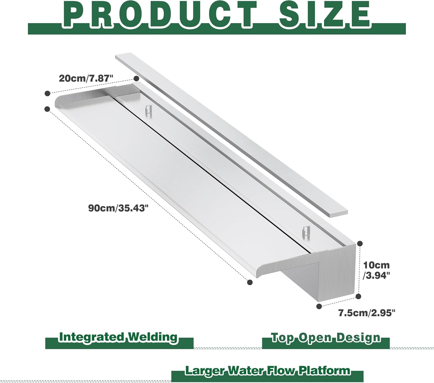 - 【Anti-Rust Spillway Waterfall】- The main body of this stainless steel spillway waterfall is welded together using 304 stainless steel for stable long-term use, featuring an top open lip design that creates elegant, invigorating, freefalling water effects to add a decorative touch to ponds and pools, letting you enjoy the relaxing sounds of water for a sense of calm and well-being. LED light strips not included, but available separately.