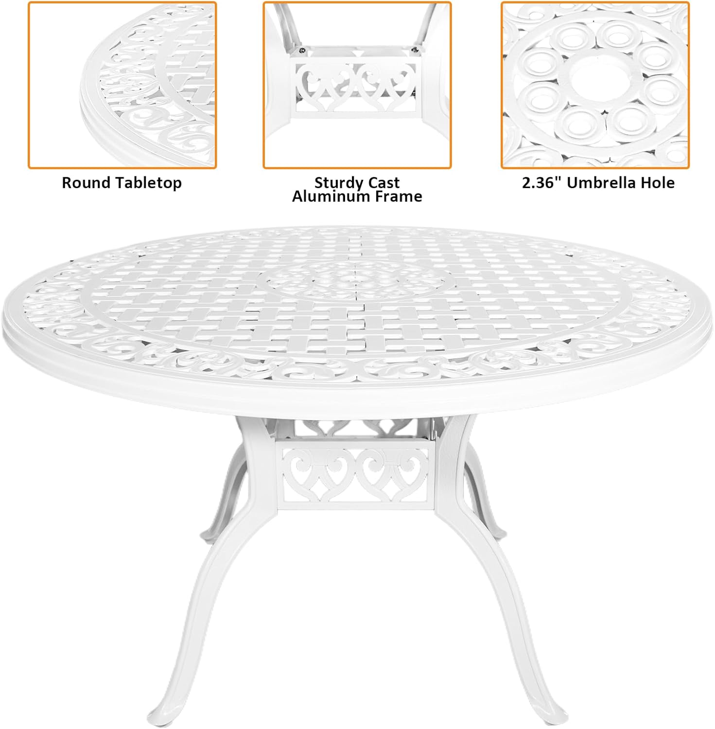 7 Pieces Cast Aluminum Outdoor Dining Set, Round 48" Dining Table with 2.36" Umbrella Hole and 6 Armchairs,All-Weather Patio Bistro Dining Set Outdoor Furniture Set for Patio, Balcony,White