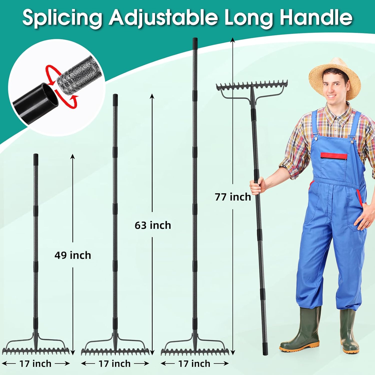 - Heavy Duty Garden Leaf Rake : Designed for long-lasting performance, this 17-tine bow rake features a high-strength metal head that withstands tough gardening and landscaping tasks like gathering leaves, breaking up soil, spreading mulch, or leveling gravel