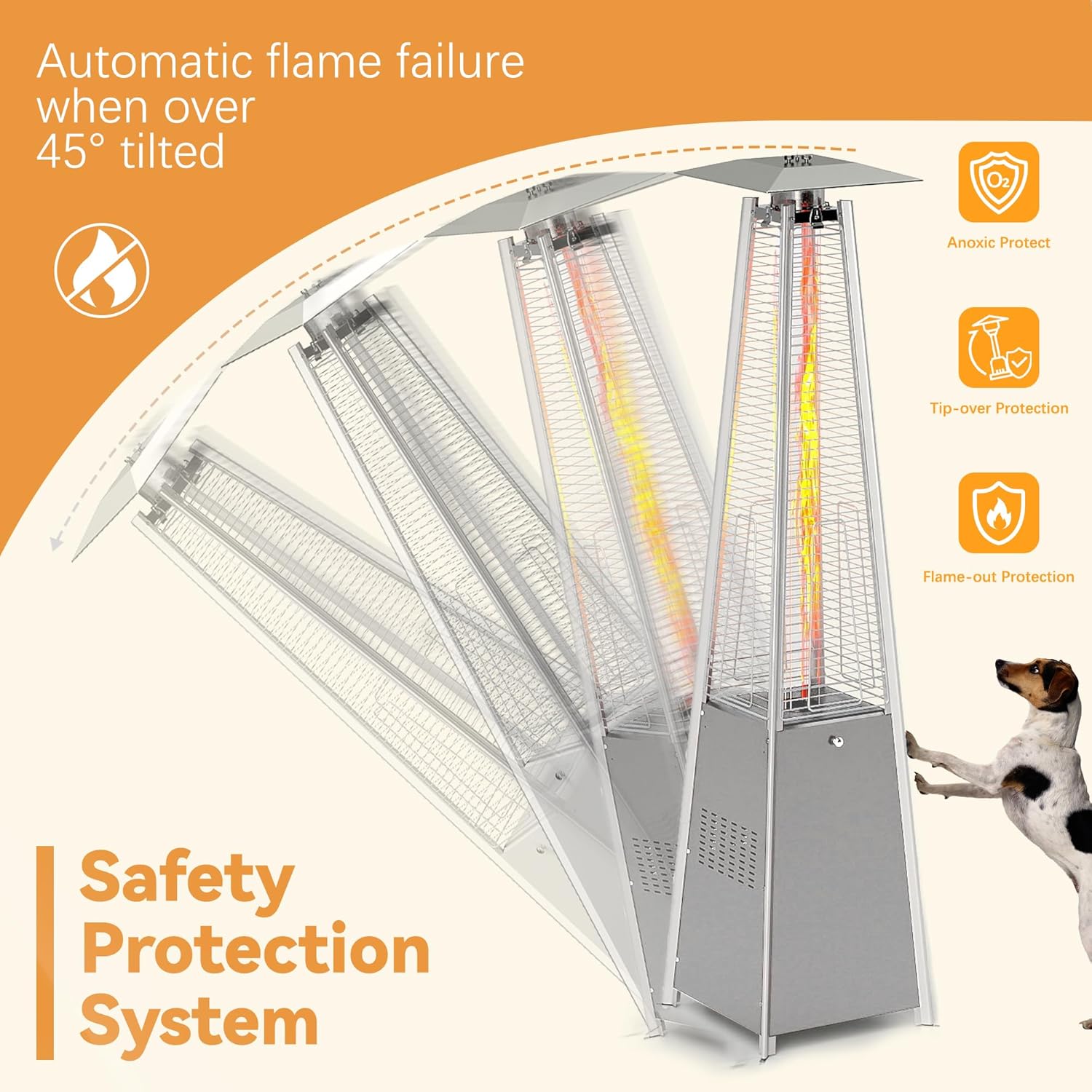 - 【Multiple Safety Protection】To avoid dangers of strong winds or accidental collisions, our pyramid patio heater has an auto-shutoff function that will automatically turn its flame off if the device is tilted more than 45 degrees. It also has an explosion-proof pipe and protective nets, ensuring you can use the outdoor heater with confidence. Additionally, each product has gone through 10,000 automatic flame-out tests before leaving the factory, so you don’t need to worry about safety issues.