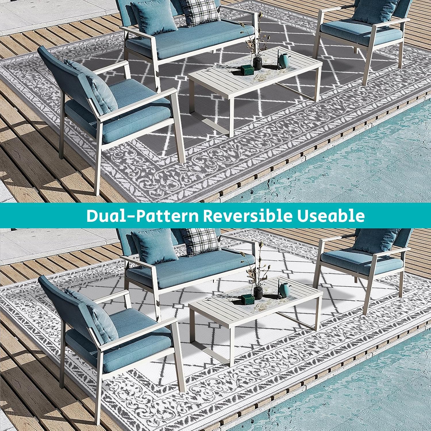 - Reversible Outdoor Rugs: Featuring a classic moroccan pattern on both sides, this 8x10 ft outdoor area rug allows you to instantly refresh your patio, porch, backyard, deck, RV campsite. And this outdoor deck rug is reversible, two-sided design allows you to have two different looks,both sides can blend perfectly with nature and look very full and comfortable.