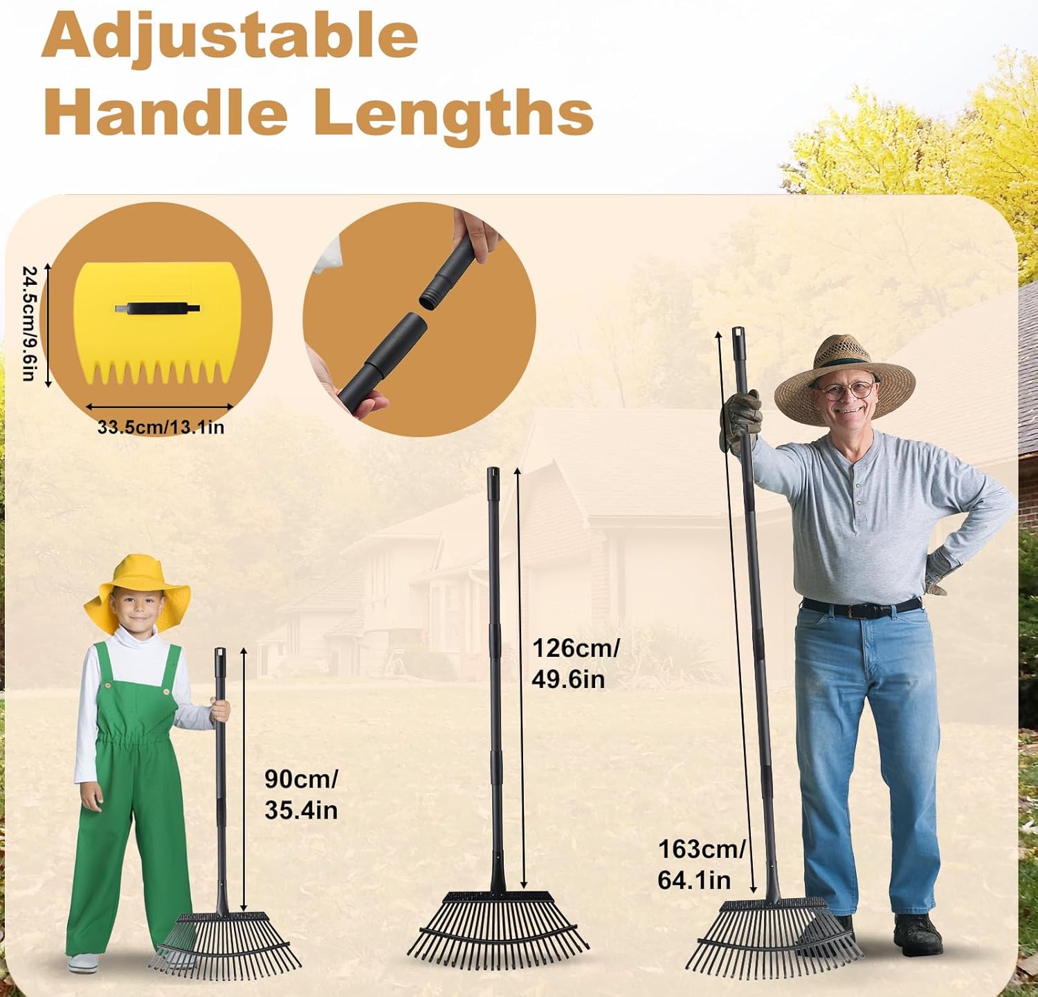 - 【Suitable For All Heights】The overall length of our leveling rake can be adjusted between 35.4 - 64.1 inches, providing you with the flexibility to collect leaves effectively without repeatedly bending over. This feature makes it suitable for most heights