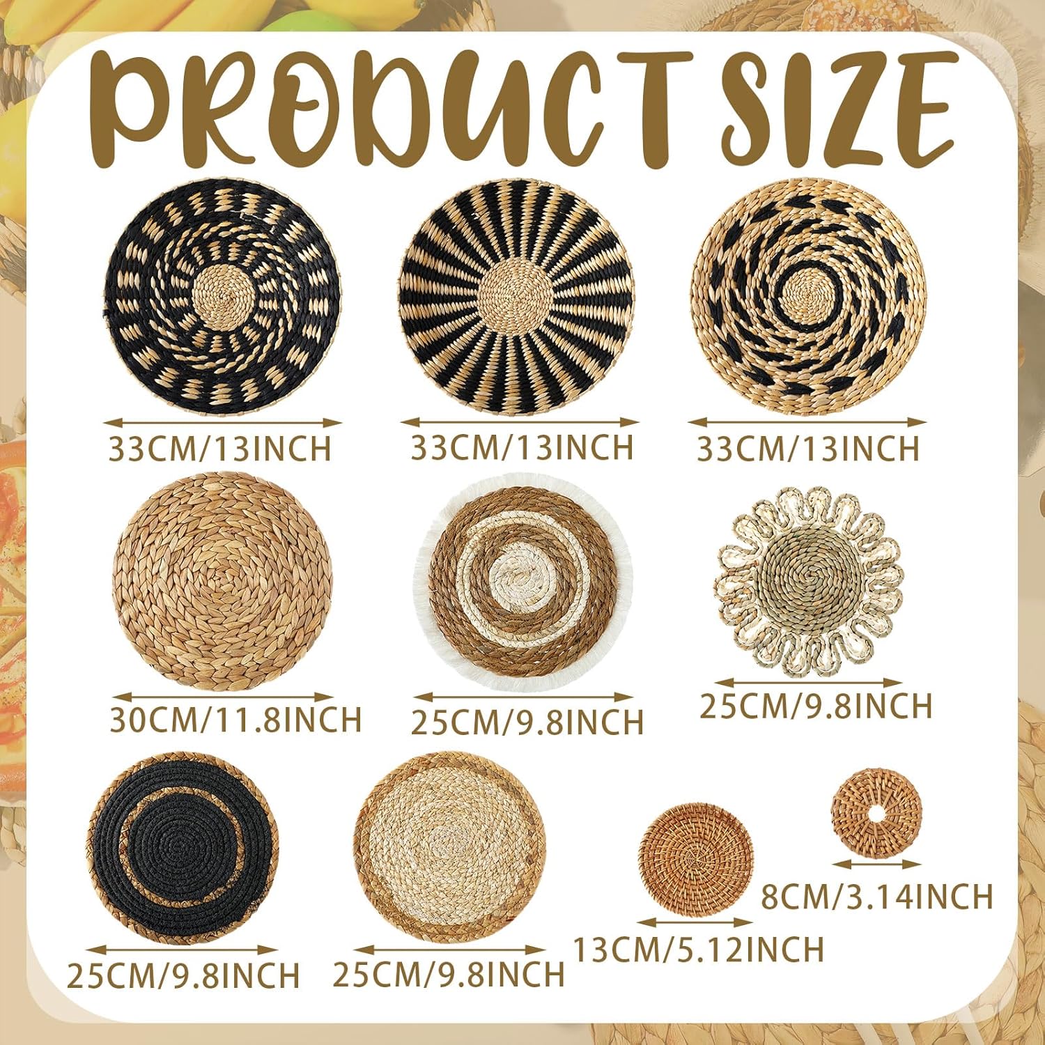 - Different Sizes: the woven wall basket measures approx. 3.15 inches/ 8 cm, 5.12 inches/ 13 cm, 9.84 inches/ 25 cm, 12.99 inches/ 33 cm, in diameter, which different sizes help you to make scattered layout, to bring you an unexpected visual effect
