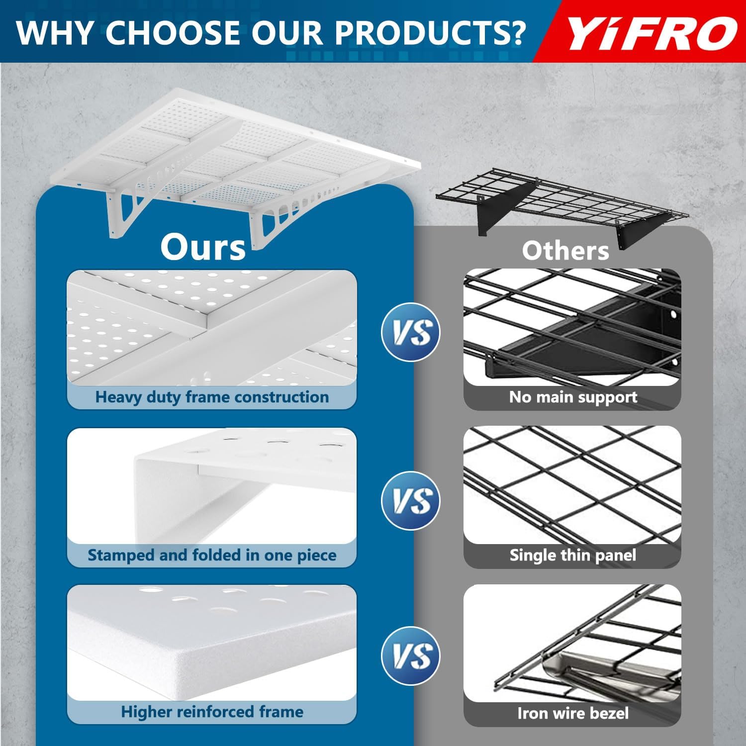- HEAVY DUTY CONSTRUCTION: YIFRO garage wall shelving takes its cues from architectural frame construction, with a 2x3 ft individual bracket load capacity of 250 lbs. and a total of 500 lbs. for 2 shelves, which makes it easy to store most of the items in your garage.