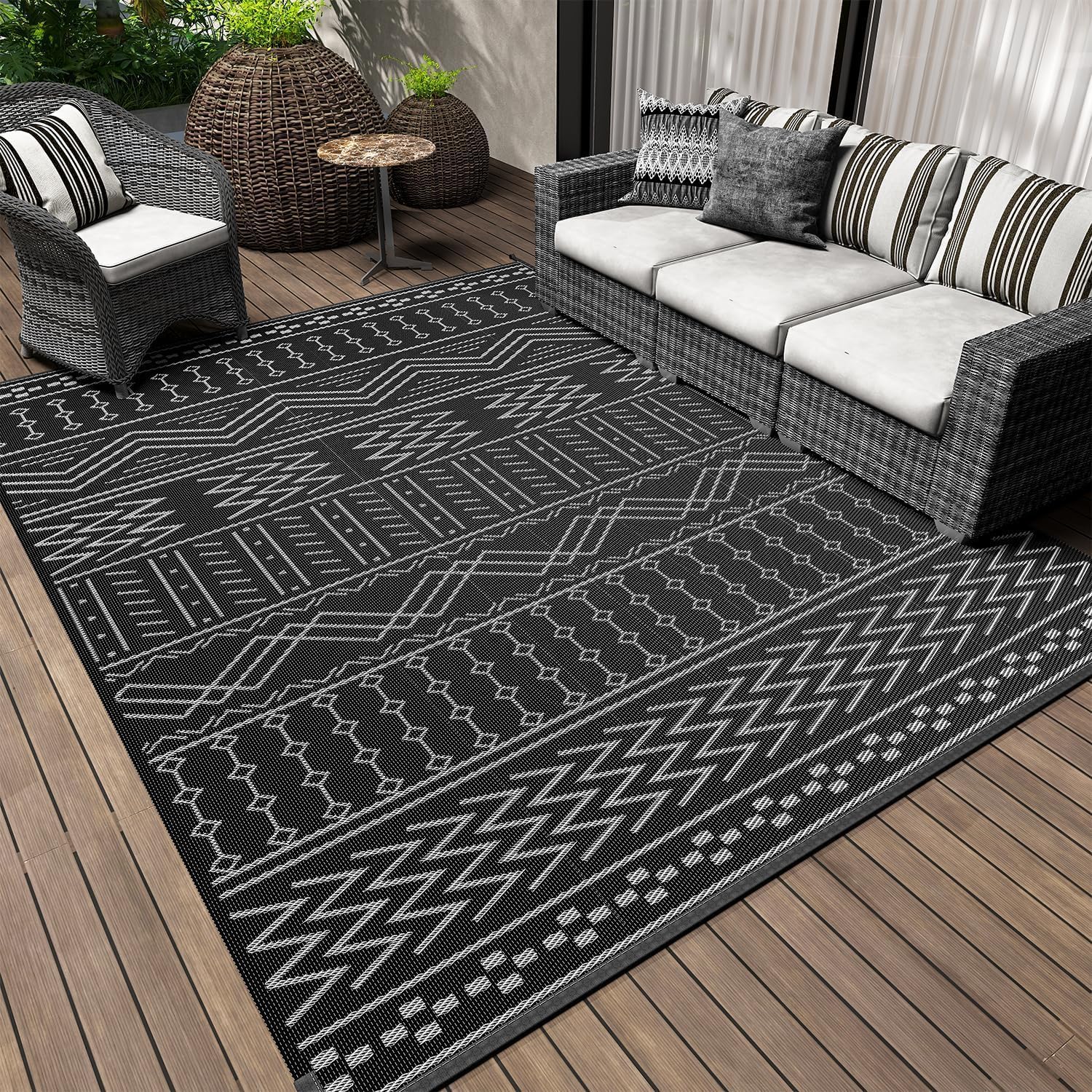 - Reversible & Versatile: Pay one but get two different looks. If one side is messed up, just flip over to get a new one. Plastic straw rug is designed for both indoor and outdoor purposes. Geometric boho style is wide-applicable for various indoor outdoor decors, adds color and sophistication to simple space.