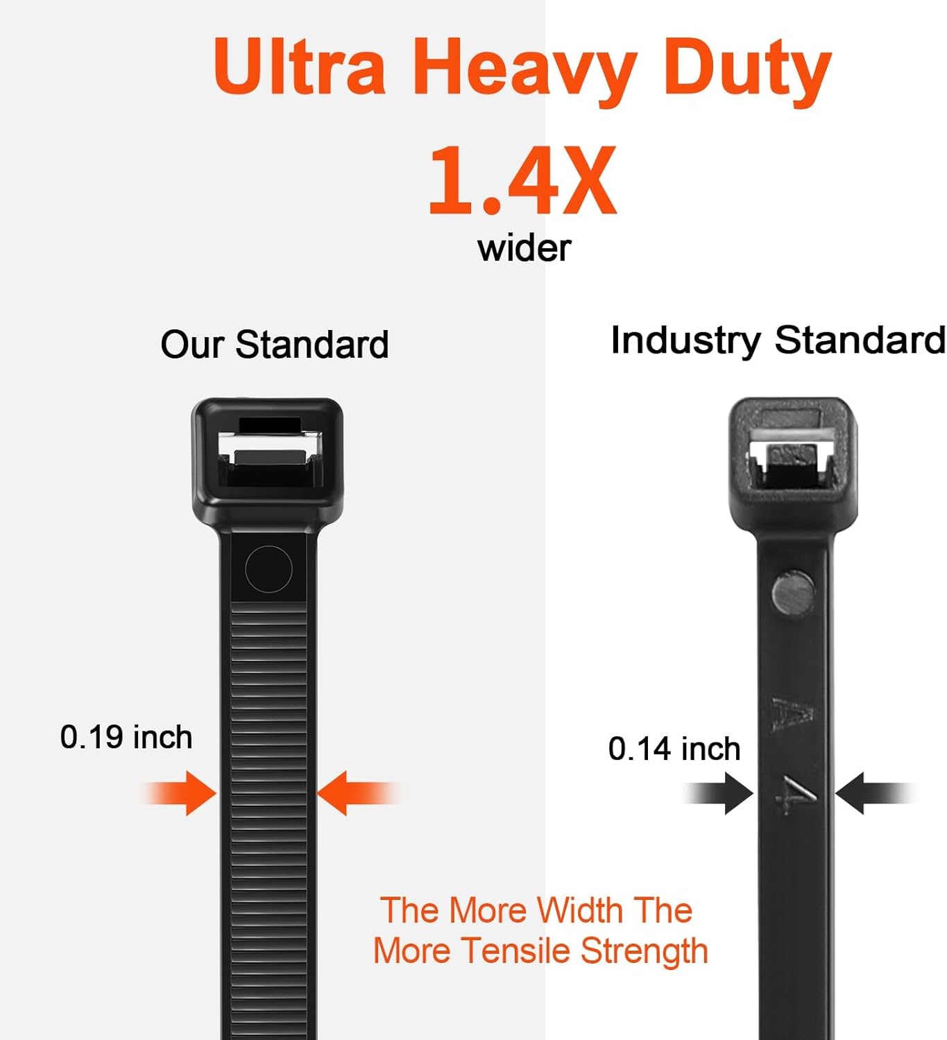 - 【100lb Tensile Strength】: The more width and Thickness, the more tensile strength. our zip ties 8 inch width is 0.19 inch(4.8mm), while industry standard is 0.14 inch(3.6mm), our zip ties 14 inch Thickness is 0.065" inch(1.65 mm), while industry standard is 0.05 inch(1.25mm),more tensile strength.