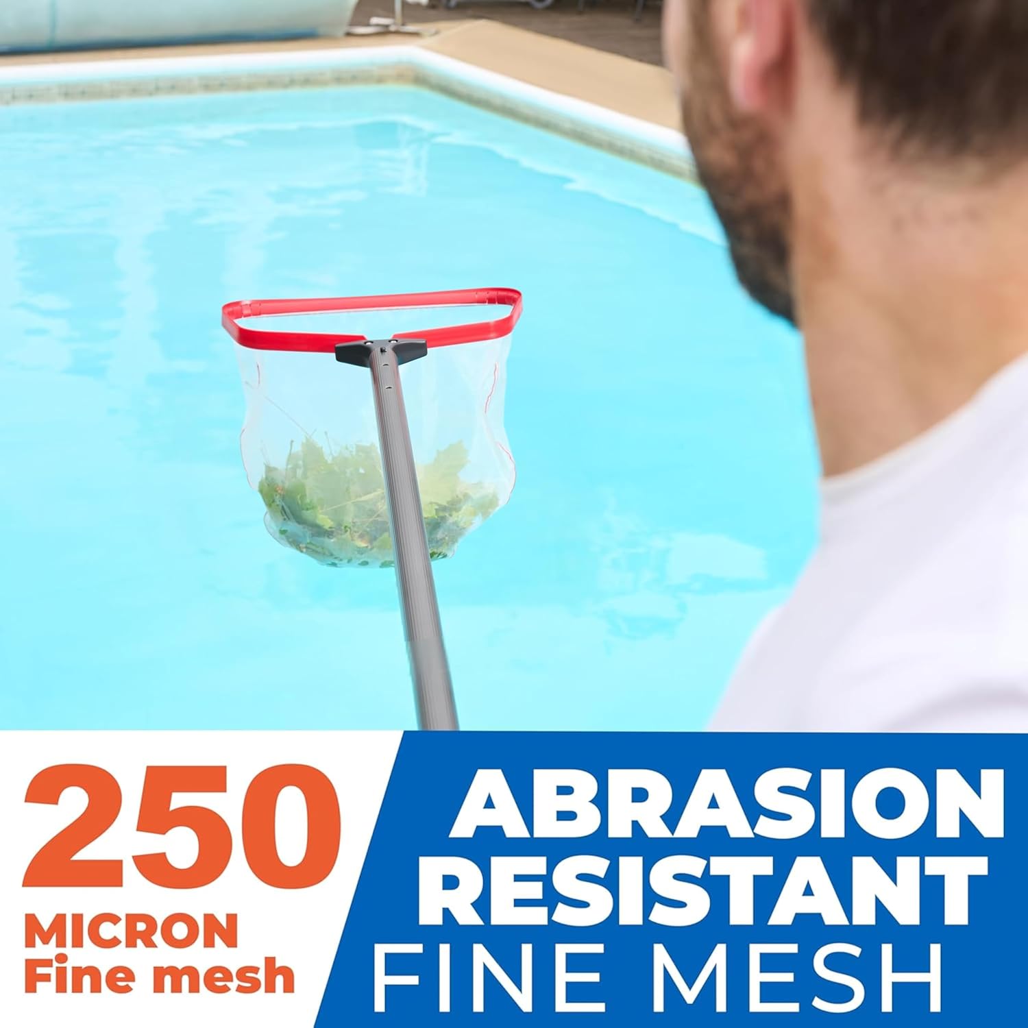 - MAXIMUM CLEANING POWER – This pool net skimmer features a fine mesh bag that captures even the smallest debris, including silt and sand. The deep pool leaf net design ensures effortless cleaning, making it ideal for cleaning leaves, bugs, and pollen for crystal-clear water.