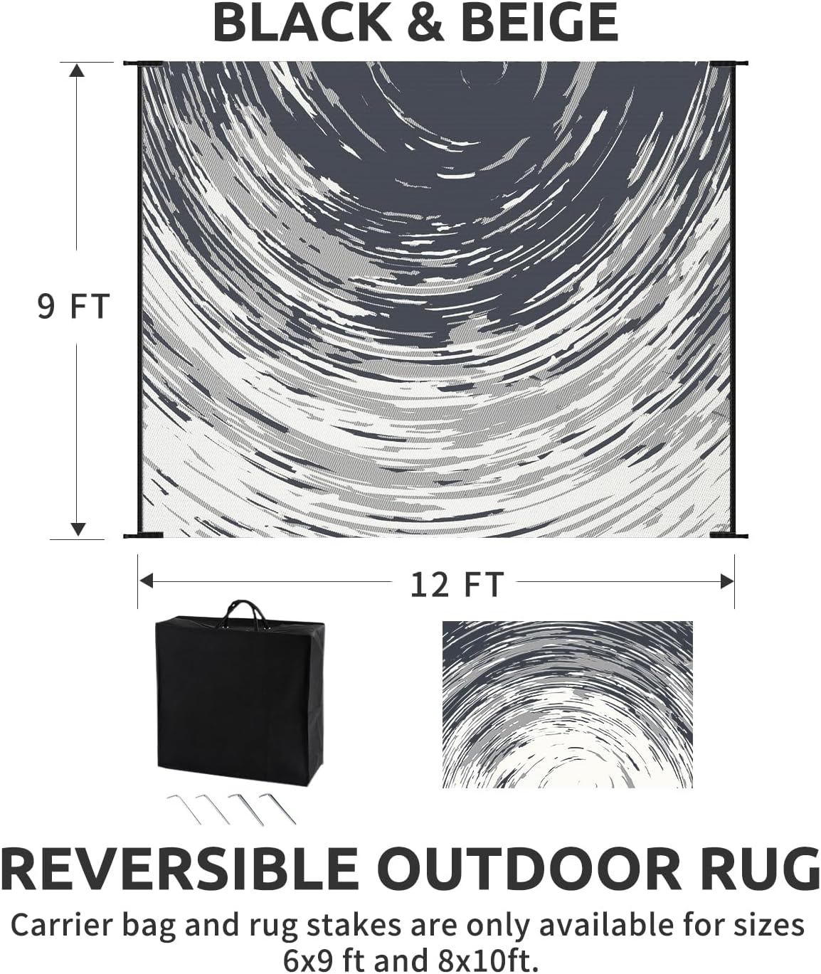 • RV traval&Camping: This camper must haves outdoor rug is ideal for picnics, gatherings, and RV trips! The lightweight outdoor camping carpet with foldable lines is easy to carry and saves space. Includes an extra carry bag and rug stakes for 6x9 ft, 8x10 ft and 9x12 ft. Grass-friendly, durable, and easy to clean, this outdoor rug enhances outdoor adventures.