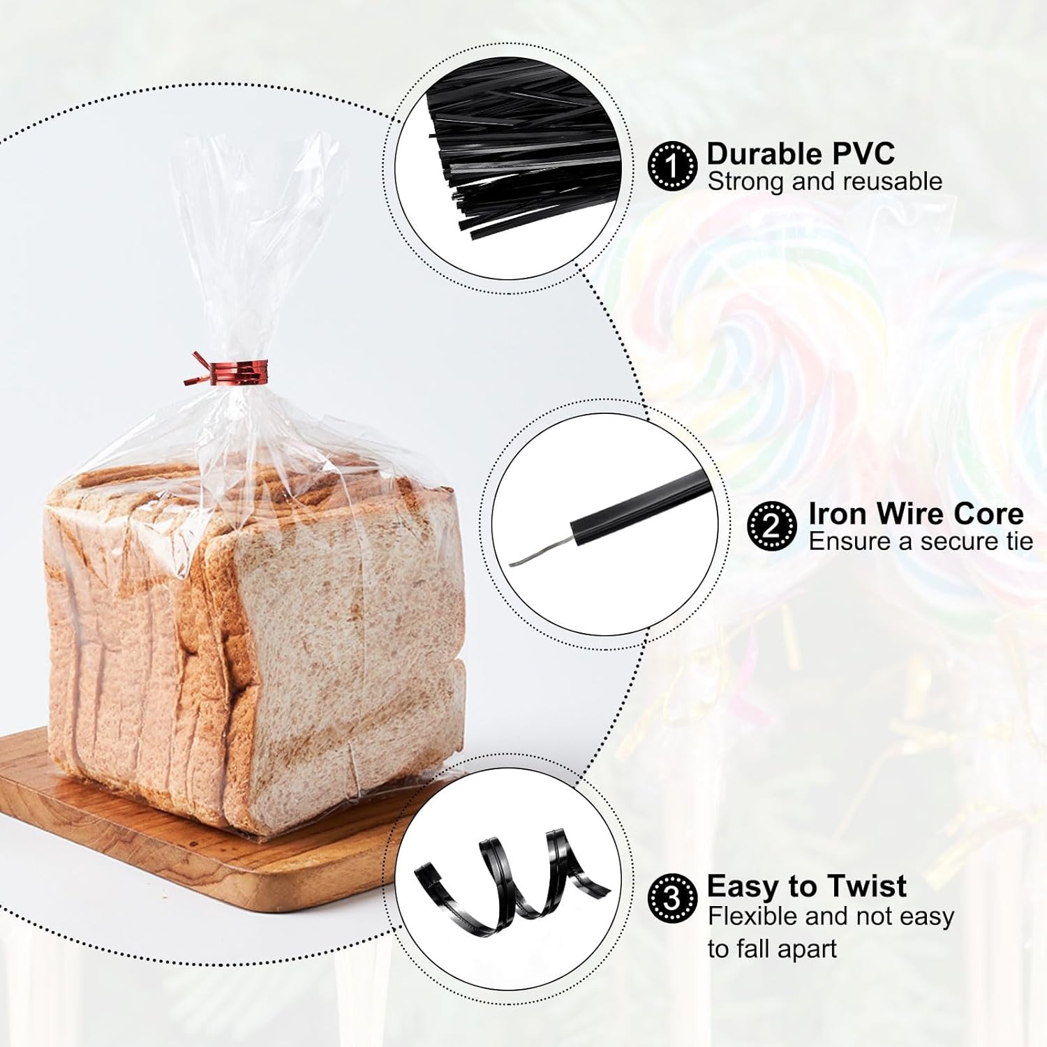 - Material - Made of durable PVC material with iron wire core, the bread twist ties are strong and reusable, which can be twisted flexibly and are not easy to fall apart.